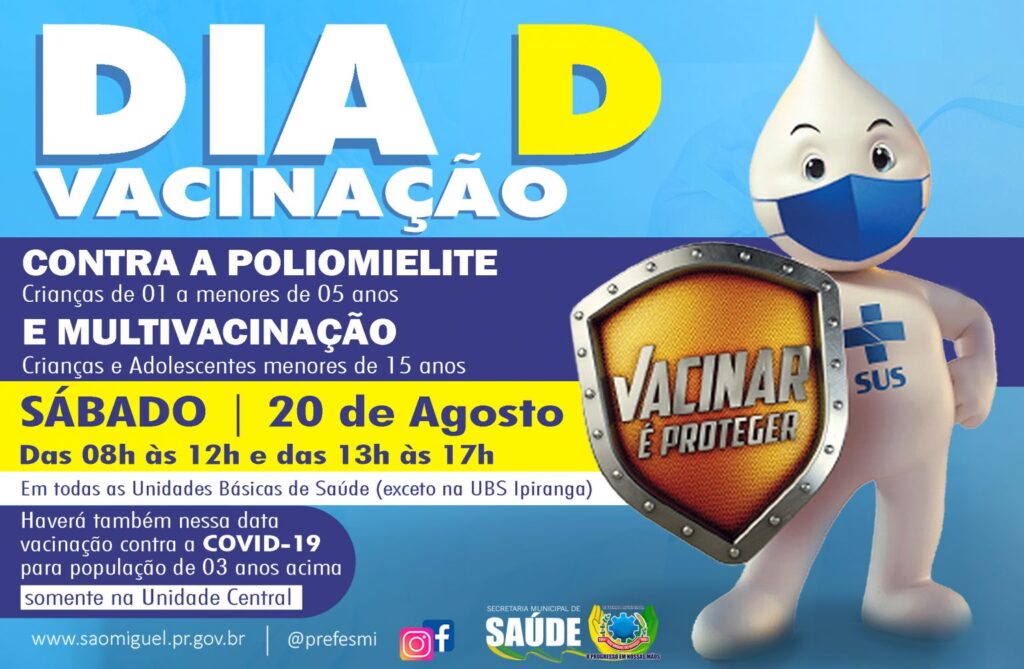 O Governo Municipal de São Miguel do Iguaçu, por meio da secretaria de Saúde, vai realizar neste sábado, 20 de agosto, o ‘Dia D’ de mobilização nacional da Campanha Nacional de Vacinação contra a Poliomielite e Multivacinação. Durante o horário das 08h00 as12h00 e das 13h00 as 17h00, as Unidades de Saúde Panorama, Novo Mundo/Santa Catarina, Gaúcha, Central/Paraguaçu, Santa Rosa, Aurora do Iguaçu e São Jorge estarão abertas para aplicação das vacinas. Na oportunidade serão imunizadas todas as crianças de 01 a 04 anos que ainda não foram vacinadas com a dose da Vacina Oral Poliomielite (VOP). Também será realizada a atualização da Caderneta de Vacinação de toda a população, independentemente da idade. Durante o ‘Dia D’ a Unidade de Saúde Central terá ainda a aplicação da vacina contra a Covid-19 para a população em geral com idade a partir dos 3 anos (1ª e 2ª doses e 1ª dose de reforço) e também será ampliada a 2ª dose de reforço (4ª dose) para trabalhadores da Saúde e trabalhadores de limpeza urbano e manejo de resíduos sólidos. ‘Orientamos os pais ou responsáveis a procurarem a Unidade de Saúde mais próxima, munidos com a Caderneta de Vacinação e cartão do SUS, para imunizarem seus filhos. Essa é grande oportunidade para cuidar do futuro das nossas crianças, pois, com as vacinas atualizadas, evitamos muitas doenças’, destacou a secretária de Saúde, Eloni Terezinha Conzatti de Queiroz.