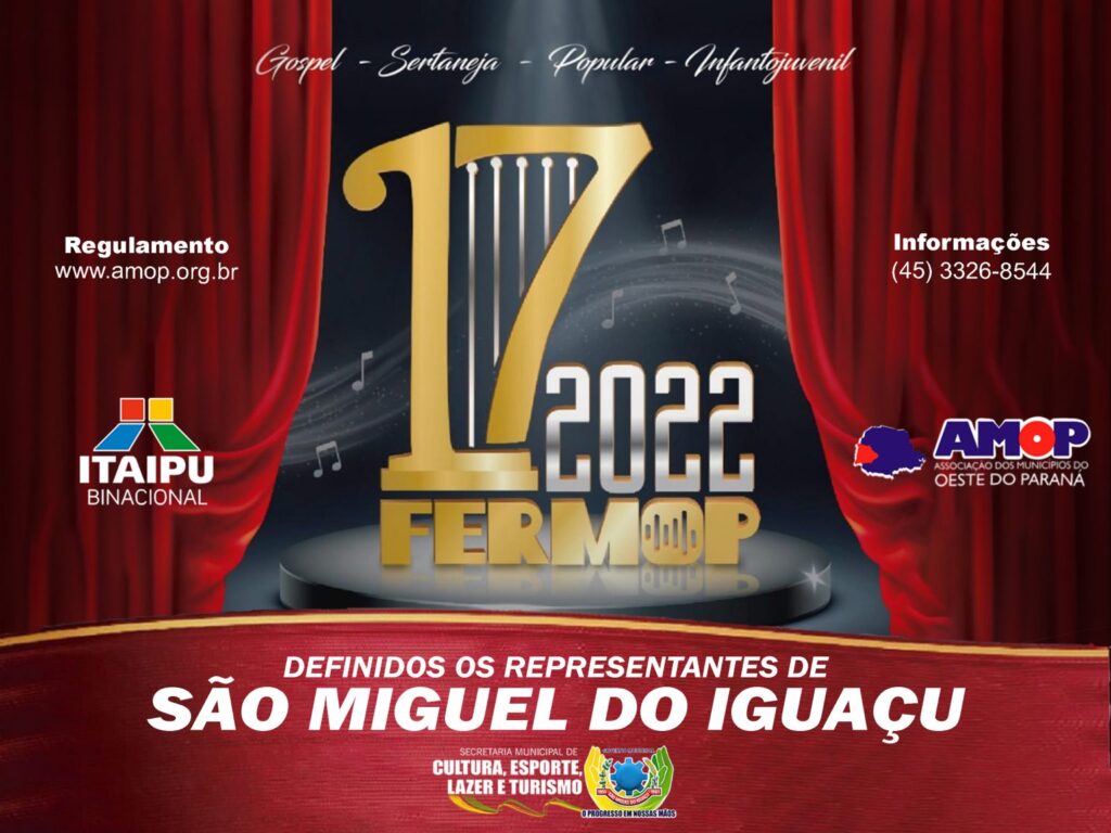 O Governo Municipal de São Miguel do Iguaçu, por meio da secretaria de Cultura, Esporte, Lazer e Turismo, está divulgando os classificados para representar o município no 17º Festival Regional dos Municípios do Oeste do Paraná, o Fermop. Ao todo, doze candidatos se inscreveram, sendo um na categoria Infantojuvenil, quatro na categoria Sertaneja, três na categoria Popular e quatro na categoria Gospel. Eles enviaram seus vídeos interpretando a música inscrita, e os materiais foram analisados por quatro jurados da área musical. Após julgamento das interpretações, os jurados encaminharam as notas para o departamento de Cultura, que realizou a soma das mesmas, sendo definidos como representantes: Categoria Infantojuvenil (10 a 15 anos): Nicolly Gabrielly; Categoria Gospel: Dienifer Leite; Categoria Popular: Duda Marques; Categoria Sertaneja: Jonas e Tininho. Os representantes de São Miguel do Iguaçu participarão da 3ª etapa classificatória, que será realizada no dia 26 de agosto, na cidade de Medianeira. O festival será transmitido ao vivo pelas redes sociais da AMOP e no local do evento será permitida a presença do público. O Governo Municipal, através do departamento de Cultura, agradece imensamente a participação de todos e parabeniza nossos representantes. Realmente São Miguel é um celeiro de talentos na música e a seleção municipal foi uma disputa muito acirrada e de alto nível.