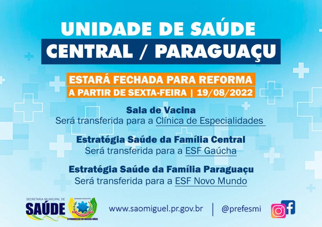 O Governo Municipal de São Miguel do Iguaçu, por intermédio da secretaria de Saúde, informa que a partir desta sexta-feira, 19 de agosto, a Unidade de Saúde Central/Paraguaçu vai estar fechada para a realização de reformas e os atendimentos serão descentralizados. A partir desta data, os usuários da sala de vacinas serão atendidos na Clínica de Especialidades, localizada na Rua Euclides da Cunha, 1345, ao lado do Pronto Atendimento do Hospital Municipal São Miguel Arcanjo. Os atendimentos referentes à Estratégia Saúde da Família Central serão realizados na Estratégia Saúde da Família Gaúcha e os usuários da Estratégia Saúde da Família Paraguaçu deverão procurar a Estratégia Saúde da Família do Bairro Novo Mundo. A secretária de Saúde, Eloni Terezinha Conzatti Queiroz, pede a compreensão de todos os usuários dessas unidades. “Essas melhorias são necessárias para melhor atender a comunidade”.