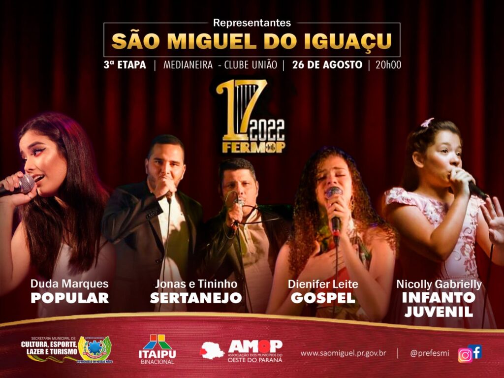 O Governo Municipal de São Miguel do Iguaçu, por meio da secretaria de Cultura, Esporte, Lazer e Turismo, estará disponibilizando um micro-ônibus para transportar munícipes que estejam interessados em acompanhar a 3ª etapa classificatória do 17º Festival Regional dos Municípios do Oeste do Paraná, o Fermop, que acontece nesta sexta-feira, 26 de agosto, em Medianeira. As vagas são limitadas e os interessados podem confirmar a vaga no transporte coletivo pelo telefone/WhatsApp: 3565-8147. A saída está prevista para as 19h00*. São Miguel do Iguaçu estará participando com representantes nas quatro categorias, sendo eles: Categoria Infantojuvenil (10 a 15 anos): Nicolly Gabrielly; Categoria Gospel: Dienifer Leite; Categoria Popular: Duda Marques; Categoria Sertaneja: Jonas e Tininho. A 3ª etapa do Fermop será realizada na sede social do Clube União, em Medianeira, a partir das 19h30. O festival também será transmitido ao vivo pelas redes sociais da AMOP. Os classificados da etapa garantirão vaga na grande final que será realizada no dia 23 de setembro, em Palotina.