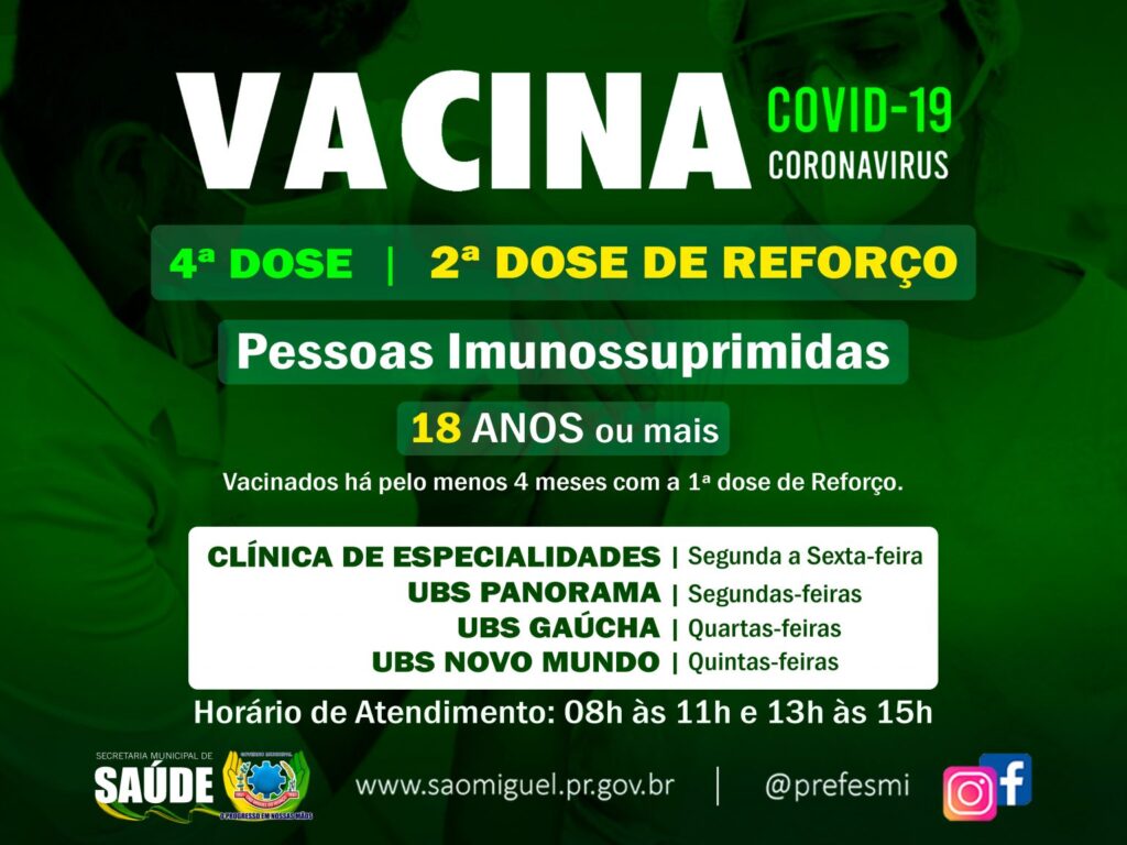 A secretaria municipal de Saúde de São Miguel do Iguaçu iniciou a aplicação da 2ª dose de reforço (4ª dose) da vacina contra Covid-19 para pessoas imunossuprimidas com idade a partir de 18 anos. Podem receber as doses pessoas imunocomprometidas que receberam a 1ª dose de reforço (3ª dose) há pelo menos 4 meses completos. De acordo com a 13ª edição do Plano Nacional de Operacionalização da Vacinação contra a Covid-19 – PNO entende-se por imunocomprometidos: I – Imunodeficiência primária grave. II – Quimioterapia para câncer. III – Transplantados de órgão sólido ou de células tronco hematopoiéticas (TCTH) uso de drogas imunossupressoras. IV – Pessoas vivendo com HIV/AIDS. V – Uso de corticoides em doses ≥20 mg/dia de prednisona, ou equivalente, por ≥14 dias. VI – Uso de drogas modificadoras da resposta imune. VII – Auto inflamatórias, doenças intestinais inflamatórias. VIII – Pacientes em hemodiálise. IX – Pacientes com doenças imunomediadas inflamatórias crônicas. As doses estão sendo aplicadas no horário das 08h00 às 11h00 e das 13h00 às 15h00, de segunda a sexta-feira na Clínica de Especialidades; todas as segundas-feiras na UBS Manoel Nicolau Bauer, do Bairro Panorama; todas as quartas-feiras na UBS Gaúcha e todas as quintas-feiras na UBS Lucia Barp da Costa, do Bairro Novo Mundo.