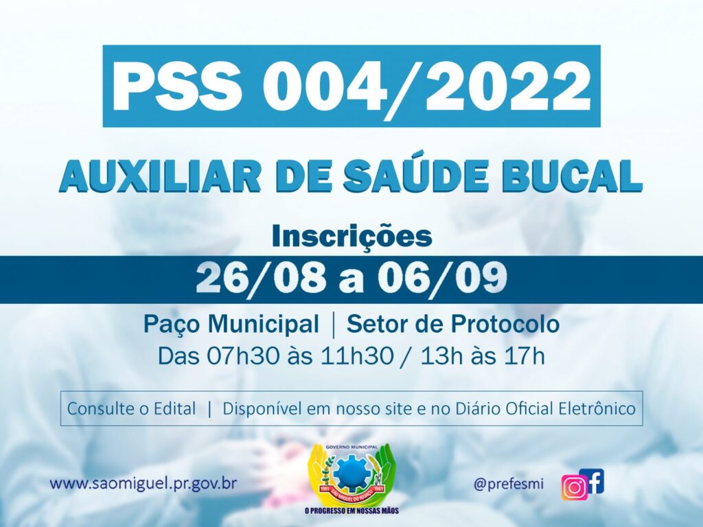 O Governo Municipal de São Miguel do Iguaçu abriu Processo Seletivo Simplificado (PSS) nº 004/2022, visando à contratação de Auxiliar de Saúde Bucal, para atuar na secretaria municipal de Saúde. As inscrições podem ser realizadas no Setor de Protocolos da prefeitura, entre os dias 26 de agosto e 06 de setembro, no horário das 07h30 às 11h30 e das 13h00 às 17h00. O candidato deverá comparecer pessoalmente ou por intermédio de procurador munido de instrumento público ou particular de mandato com firma reconhecida em cartório com poderes específicos, para efetivar a inscrição. Estão sendo ofertadas duas vagas, mais cadastro de reserva, e o Contrato de Trabalho será de 40 horas semanais pelo regime CLT. A remuneração é de R$ 1.436,77. Mais detalhes do PSS 004/2022, publicado no dia 25 de agosto, estão disponíveis no Diário Oficial Eletrônico do município.