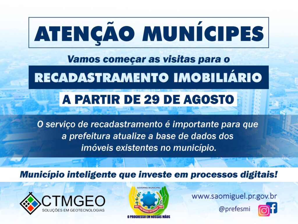 O Governo Municipal de São Miguel do Iguaçu informa que a partir desta segunda-feira, 29, equipes da CTMGEO Soluções em Tecnologia vão percorrer as ruas da cidade para iniciar o recadastramento imobiliário. As visitas serão realizadas de segunda à sexta-feira, no horário das 08h00 às 18h00. O trabalho visa à atualização de dados dos imóveis existentes no município, o chamado georreferenciamento. Esse serviço deverá durar de 03 a 04 meses e as pessoas envolvidas estarão devidamente identificadas com crachás e coletes. O georreferenciamento foi criado para se eliminar as falhas de levantamentos topográficos antigos, o que por vezes gerava áreas sobrepostas e grandes discussões jurídicas, além de cumprir as exigências da Lei 10.267/01. Qualquer dúvida ou informação sobre o serviço, o munícipe pode entrar em contato com o fone/whats 3565-8109.