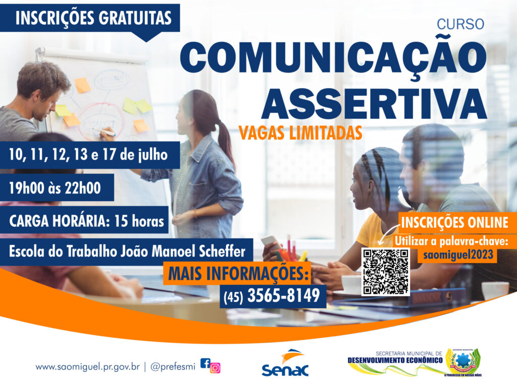 O Governo Municipal de São Miguel do Iguaçu, por meio da secretaria de Desenvolvimento Econômico, e o Serviço Nacional de Aprendizagem Comercial (Senac) estão com inscrições abertas para o curso de Comunicação Assertiva. As vagas são limitadas e as inscrições, que são gratuitas, devem ser realizadas pelo link: https://www.pr.senac.br/cursos/?uep=6&tc=202300070, palavra chave saomiguel2023. O curso terá uma carga horária de 15 horas e será desenvolvido nos dias 10, 11, 12, 13 e 17 de julho de 2023, no horário das 19h00 às 22h00, na Escola do Trabalho João Manoel Scheffer. O aluno vai estudar o seguinte conteúdo: Comunicação como processo e como instrumento; Elementos do processo de comunicação; Tipos de comunicação: passiva, agressiva e assertiva; Tipos de personalidade; Dificuldades de relacionamento; Barreiras à comunicação; Componentes do processo de comunicação; Assertividade. De acordo com o secretário de Desenvolvimento Econômico, Valcir Teixeira, o curso é resultado de uma parceria que tem como objetivo ensinar as pessoas como elas podem comunicar-se de forma a obter os resultados desejados. “Esse curso é muito interessante, pois busca orientar os cidadãos como eles devem passar as informações com clareza, dinâmica e respeito para obter o retorno esperado”. Mais informações podem ser obtidas pelo telefone: 45-3565-8149. ASSESSORIA DE COMUNICAÇÃO, IMPRENSA E MIDIA SOCIAL