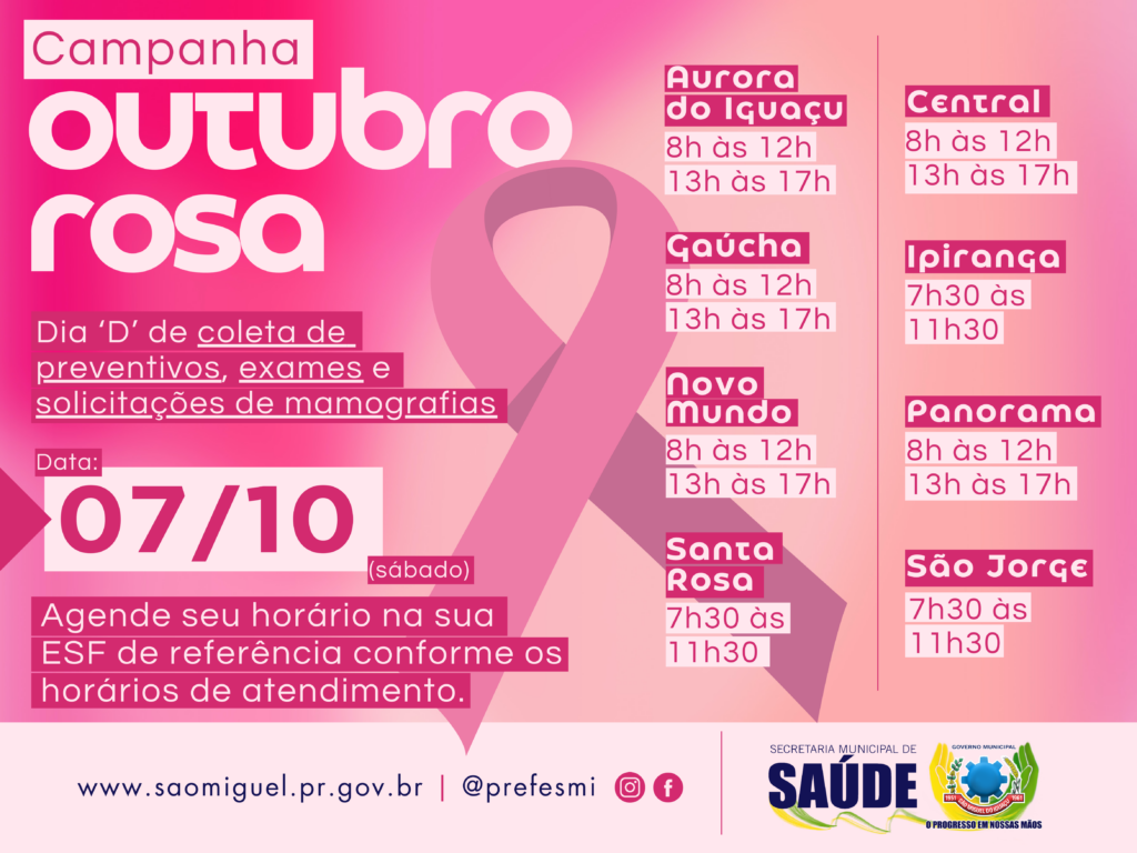 O Governo Municipal de São Miguel do Iguaçu, por intermédio da Secretaria de Saúde, vai realizar neste sábado, dia 07, o ‘Dia D’ de coleta de preventivos, exames e solicitações de mamografias, evento que vai marcar o início das ações alusivas ao Outubro Rosa. Nesse dia também estarão disponíveis consultas de odontologia para as mulheres, para que elas consigam fazer ou iniciar o tratamento odontológico. As atividades preventivas do ‘Dia D’ serão realizadas nas Estratégias Saúde da Família (ESF) Central, Panorama, Novo Mundo, Gaúcha, São Jorge, Santa Rosa, Aurora do Iguaçu e Balneário Ipiranga. Os horários de atendimento seguem o seguinte cronograma: Central: 08h00 às 12h00 e 13h00 às 17h00 Panorama: 08h00 às 12h00 e 13h00 às 17h00 Novo Mundo: 08h00 às 12h e 13h00 às 17h00 Gaúcha: 08h às 12h e 13h00 às 17h00 São Jorge: 07h30 às 11h30 Aurora do Iguaçu: 08h00 às 12h00 e 13h00 às 17h00 Balneário Ipiranga: 07h30 às 11h30 Santa Rosa do Ocoí: 07h30 às 11h30 Na ESF Central essa ação também será realizada diariamente, e também com horário especial nos dias 10 e 24 de outubro, das 17h00 às 22h00. A ação preventiva integra as atividades do Outubro Rosa, uma campanha de conscientização que tem como objetivo principal alertar as mulheres e a sociedade sobre a importância da prevenção e do diagnóstico precoce do câncer de mama e mais recentemente sobre o câncer de colo do útero. A secretária de Saúde, Eloni Teresinha Conzatti de Queiroz, convoca as mulheres para aproveitarem esse momento onde os profissionais da saúde estarão focados nesse trabalho. “Se for descoberto no início, um em cada três casos de câncer de mama pode ser curado. Medo e desinformação são apontados como os principais fatores que atrasam o diagnóstico precoce e o tratamento”, alertou. ASSESSORIA DE COMUNICAÇÃO, IMPRENSA E MIDIA SOCIAL