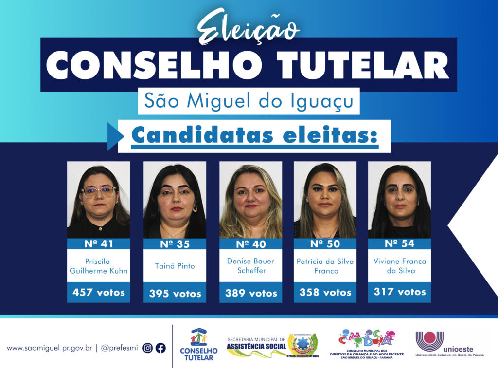 Foi realizada ao longo do último domingo, dia 01 de outubro, a eleição para escolha dos novos conselheiros tutelares de São Miguel do Iguaçu, que irão assumir a gestão 2024/2027. Ao todo, 2691 eleitores são-miguelenses compareceram ao Centro Esportivo Valter Marcon para votação. Confira o resultado: 1º Priscila Guilherme Kuhn – 457 votos 2º Tainã Pinto – 395 votos 3º Denise Bauer Scheffer – 389 votos 4º Patrícia da Silva Franco – 358 votos 5º Viviane Franca da Silva – 317 votos 6º Ana Civiero – 218 votos 7º Marilani de Toni Scheffer (Mari) – 191 votos 8º Aline Fernanda Campagnaro – 141 votos 9º Regiane Bilski de Lima Liczbinski (Regi) – 97 votos 10º Márcio Ortiz (Sargento Ortiz) – 92 votos Foram registrados ainda 29 votos nulos e 07 votos em branco. Os cinco primeiros colocados foram eleitos e outros cinco ficam como suplentes. A posse dos eleitos será realizada no dia 10 de janeiro de 2024. ASSESSORIA DE COMUNICAÇÃO, IMPRENSA E MIDIA SOCIAL