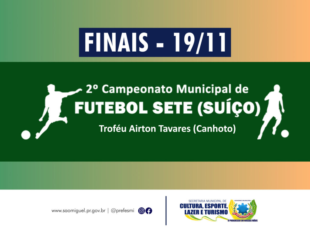 As finais do 2º Campeonato Municipal de Futebol Sete (Suiço) – Troféu Airton Tavares (Canhoto) serão realizadas no próximo dia 19 de novembro, um domingo. A alteração foi confirmada pela secretaria de Cultura, Esporte, Lazer e Turismo, que organiza a competição, após a solicitação de muitas equipes, que alegaram não ter condições de disputar as partidas na data marcada anteriormente (15 de novembro). O confrontos serão disputados no campo 01 do Parque de Exposições, conforme a seguinte programação: 16h00 – Feminino Transmorgan x Oficina do Óculos/Grazy Flores 17h00 – 48+ Masculino Solar SMI /Recanto de Festas/ Transmorgan x Panificadora e Confeitaria Kipão 18h00 – 38+ Masculino Transmorgan/Solar SMI/Recanto de Festas x Imperio do Chopp/Amigos do Futebol 19h00 – Livre Masculino Resenha do DM x Kipão/ CHDS do Brasil/Transmorgan Logo após o último jogo será realizada a cerimônia de entrega dos troféus e medalhas. ASSESSORIA DE COMUNICAÇÃO, IMPRENSA E MIDIA SOCIAL