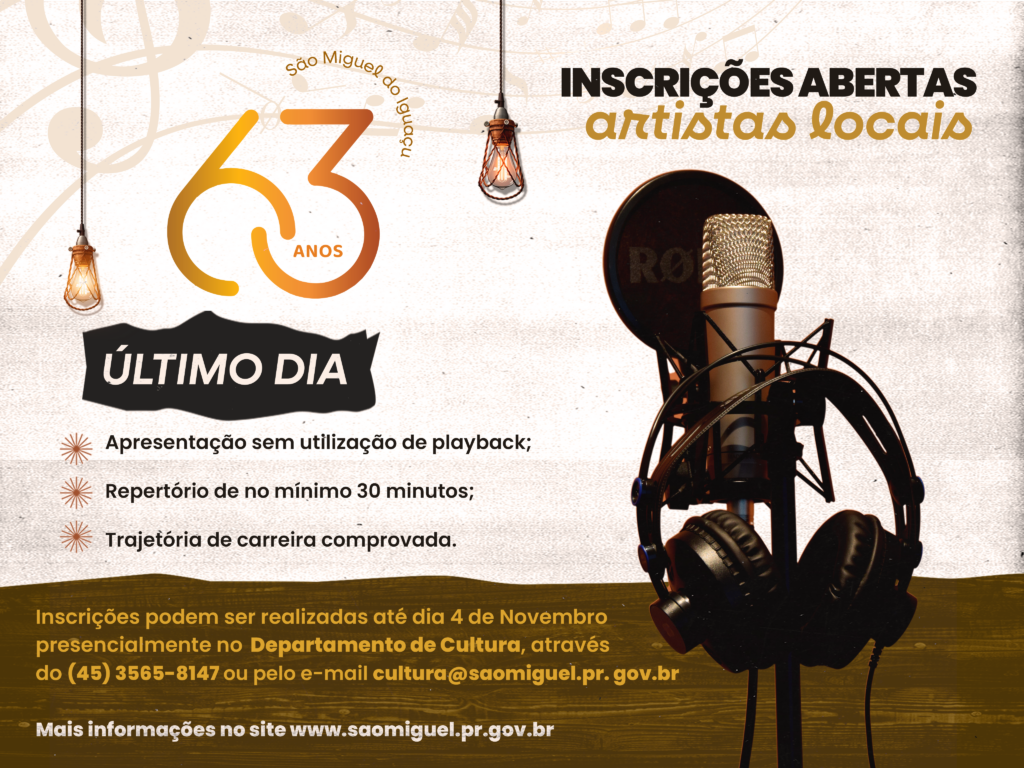 Termina nesta segunda-feira, 04 de novembro, o prazo para inscrição dos artistas locais interessados em se apresentar nas festividades do Aniversário de 63 anos de São Miguel do Iguaçu. O evento está sendo organizado pelo Governo Municipal e será realizado de 28 a 30 de novembro, na Rua Coberta Addy Calvalca. As inscrições estão sendo realizadas gratuitamente no departamento de Cultura, localizado no Centro Cultural Avelino Vieira, por meio do telefone/WhatsApp (45) 3565-8147 ou ainda pelo e-mail: cultura@saomiguel.pr.gov.br, até a próxima segunda-feira, dia 04 de novembro. ‘Tivemos uma boa procura de interessados que retiraram as fichas de inscrições, porém, poucos fizeram a devolução da ficha preenchida. É muito importante que não percam o prazo’, alertou a diretora de Cultura, Marlei Scussel Farias. Para a inscrição ser validada, é necessário preencher corretamente a Ficha de Inscrição que será entregue pessoalmente ou pode ser solicitada nos contatos informados anteriormente. Podem se inscrever cantores, duplas, trios, grupos musicais e/ou bandas de São Miguel do Iguaçu que tocam os estilos sertanejo, pagode, pop rock ou gospel. Os interessados devem apresentar no ato da inscrição comprovante de residência, repertório de 30 minutos e também apresentar sua trajetória musical por meio de vídeo e/ou links, onde a Comissão Organizadora poderá conhecer os candidatos. Para este evento, será montado um tablado em meio a Praça de Alimentação, deixando os artistas ainda mais próximos do público. Serão disponibilizados pela organização para as apresentações o tablado e toda a estrutura de som e iluminação. Cada artista ficará responsável pelos músicos e instrumentos para as apresentações musicais que deverão ter duração de 30 minutos cada. Não será permitido o uso de playback. Após o término das inscrições será realizada uma seleção de no máximo quatro atrações por noite, que receberão um cachê artístico pela apresentação. Além disso, a programação do Aniversário de 63 anos terá ainda shows nacionais gratuitos com Fernando & Sorocaba, Antoy & Gabriel e Traia Véia, além de Parque Kids gratuito, praça de alimentação e muito mais! ASSESSORIA DE COMUNICAÇÃO, IMPRENSA E MIDIA SOCIAL