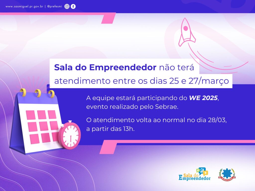 O Governo Municipal de São Miguel do Iguaçu, por meio da Secretaria de Desenvolvimento Econômico e Turismo, comunica que não haverá atendimento na Sala do Empreendedor entre os dias 25 e 27 de março. Durante o período, a equipe da Sala estará participando do We 2025, evento realizado pelo Sebrae (Serviço Brasileiro de Apoio às Micro e Pequenas Empresas, em Curitiba. No encontro haverá o reconhecimento e entrega do Selo de Referência em atendimento de 2024, lançamento do Selo de Referência em Atendimento de 2025, alinhamentos estratégicos, capacitações com temas essenciais para manter-se atualizado e sempre à frente além de conexão e troca de experiências entre os atendentes dos Pontos de Atendimento e Salas do Empreendedor. O atendimento na Sala do Empreendedor de São Miguel volta ao normal no dia 28 de março, a partir das 13h00. Quem deseja emitir boleto DAS, poderá baixar o app MEU SEBRAE, ou entrar no link https://www8.receita.fazenda.gov.br/simplesnacional/aplicacoes/atspo/pgmei.app/identificacao. ASSESSORIA DE COMUNICAÇÃO, IMPRENSA E MIDIA SOCIAL