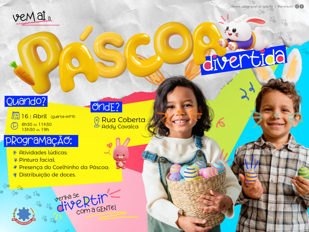 O Governo Municipal de São Miguel do Iguaçu, por meio da Secretaria de Cultura e Esporte, vai realizar no próximo dia 16 de abril a ‘Páscoa Divertida’, evento que vai acontecer na Rua Coberta Addy Cavalca, das 08h30 às 11h30 e das 13h30 às 19h00. O objetivo é festejar a Páscoa com as crianças, desenvolvendo atividades lúdicas, pintura facial, distribuição de doces, além da presença do coelhinho da Páscoa. A diretora de Cultura, Marlei Scussel Farias, disse que vai ser um dia divertido com a presença das crianças e seus familiares. “Estamos preparando tudo com muito carinho e dedicação”, completou. O Secretário de Cultura e Esporte, Sandro Alexandre (Tatu), convida as famílias e comunidade em geral para prestigiar esse maravilhoso evento. “Vamos juntos fazer a alegria das nossas crianças”, celebrou. ASSESSORIA DE COMUNICAÇÃO, IMPRENSA E MIDIA SOCIAL