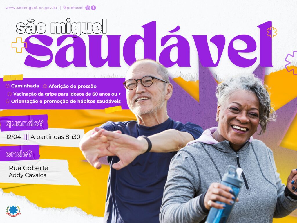 Para celebrar o Dia Mundial da Saúde, o Dia Mundial da Atividade Física e o Dia de Combate à Hipertensão, o Governo Municipal de São Miguel do Iguaçu, por meio da Secretaria de Saúde, vai realizar neste sábado, 12 de abril, a 3ª edição do projeto ‘São Miguel Saudável’. O evento será realizado a partir das 08h30, na Rua Coberta Addy Cavalca, e é destinado à toda comunidade, com o objetivo de promover hábitos de vida mais saudáveis. Haverá uma caminhada em algumas ruas da cidade, aferição de pressão e para os idosos com 60 anos ou mais, haverá a estratificação de risco do idoso e a entrega da caderneta de saúde da pessoa idosa – um documento essencial que reúne todas as informações clínicas e funcionais para um melhor acompanhamento da saúde. Terá ainda um estande com cuidados para evitar queda dos idosos, com o apoio da Uniguaçu. “Também estará disponível a vacinação contra a Influenza para este público”, informa a fisioterapeuta Laís Ferreira de Farias. A secretária de Saúde, Adriana da Silva Motta, convida a comunidade para participar e fazer desse encontro um dia especial. “Traga familiares e amigos e venha cuidar da saúde conosco”, relatou. ASSESSORIA DE COMUNICAÇÃO E MÍDIA SOCIAL