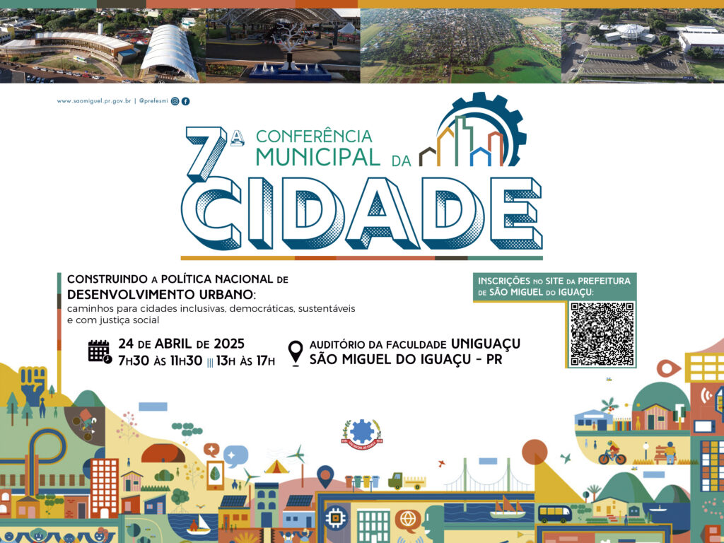 O Governo Municipal de São Miguel do Iguaçu, por meio da Secretaria de Planejamento, e o Conselho Municipal da Cidade, promove e convoca a comunidade para a 7ª Conferência Municipal da Cidade, com o tema “Construindo a Política Nacional do Desenvolvimento Urbano: caminhos para cidades inclusivas, democráticas, sustentáveis e com justiça social”. O evento acontecerá no dia 24 de abril, no auditório da Faculdade Uniguaçu, a partir das 07h30, e tem por objetivo promover o diálogo entre o poder público e a sociedade civil sobre os rumos do desenvolvimento urbano local e nacional. “Com o lema ‘Cidades Inclusivas, Participativas e Socialmente Justas’, a conferência tem como propósito central discutir e propor diretrizes para a construção da Política Nacional de Desenvolvimento Urbano (PNDU), respeitando as especificidades e demandas da população são-miguelense’, destaca o secretário de Planejamento, Luciano Aparecido Neris. Durante o encontro, representantes da sociedade civil organizada, movimentos populares, setor empresarial, acadêmico, conselhos profissionais e gestores públicos irão debater temas fundamentais como: habitação de interesse social, mobilidade urbana, planejamento territorial, meio ambiente, saneamento básico, regularização fundiária e governança democrática. A conferência também será uma oportunidade para eleger os delegados que representarão São Miguel do Iguaçu na etapa estadual, contribuindo com propostas que irão compor o documento base da 6ª Conferência Nacional das Cidades, prevista para acontecer ainda este ano em Brasília. Para participar da eleição no cargo de delegado será necessário anexar a seguinte documentação, após realizar o preenchimento do cargo na inscrição: ofício da entidade indicando o candidato a delegado; cartão CNPJ; Estatuto Social; Ata; CPF e RG, ou CNH do candidato e comprovante de endereço do candidato. A participação popular é um dos pilares da conferência, reforçando o compromisso do município com a construção de políticas públicas voltadas para cidades mais humanas, resilientes e solidárias. As inscrições e a programação da 7ª Conferência da Cidade de São Miguel do Iguaçu podem ser realizadas no link https://encurtador.com.br/9VpUy ASSESSORIA DE IMPRENSA E MIDIA SOCIAL