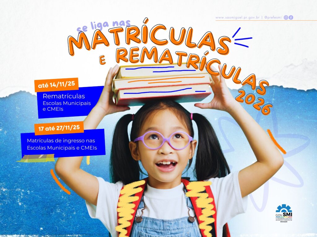 O Governo Municipal de São Miguel do Iguaçu, por meio da Secretaria de Educação, iniciou na segunda-feira, 3 de novembro, o cronograma de rematrículas e matrículas para o ano letivo de 2026 nas escolas municipais e Centros Municipais de Educação Infantil (CMEIs). Os pais ou responsáveis devem comparecer à instituição de ensino mais próxima de sua residência para realizar o cadastro do aluno, portando os seguintes documentos: Para matrículas novas: Certidão de Nascimento da criança, comprovante de residência, declaração de vacinas e CPF do responsável; Para rematrículas: declaração de vacinas, comprovante de residência e CPF do responsável. O cronograma definido pela Secretaria de Educação é o seguinte: De 3 a 14 de novembro de 2025: rematrículas para todos os níveis e modalidades de ensino; De 17 a 27 de novembro de 2025: matrículas novas (ingressos). A secretária de Educação, Solange Gamba, destaca a importância de os pais ou responsáveis ficarem atentos aos prazos. “Esse é um momento importante para o planejamento do próximo ano letivo. Pedimos que as famílias compareçam dentro do período estabelecido para garantir a vaga dos alunos e contribuir com a organização da rede municipal de ensino”, reforçou. ASSESSORIA DE COMUNICAÇÃO E MIDIA SOCIAL