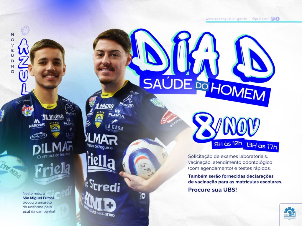 O Governo Municipal de São Miguel do Iguaçu, por meio da Secretaria de Saúde, promove neste sábado, 08 de novembro, o “Dia D” da campanha Novembro Azul, com atendimentos voltados à saúde do homem em todas as Estratégias de Saúde da Família (ESF) do município. As unidades estarão abertas em horário ampliado, das 08h00 às 12h00 e das 13h00 às 17h00, oferecendo diversos serviços com o objetivo de facilitar o acesso e incentivar o cuidado preventivo. Durante todo o dia, serão realizados pedidos de exames laboratoriais, vacinação, testes rápidos e atendimentos odontológicos – este último mediante agendamento prévio. Além disso, as salas de vacina também estarão emitindo a declaração de vacinação infantil, documento necessário para matrículas e rematrículas escolares. A secretária de Saúde, Adriana da Silva Motta, ressaltou a importância da ação e reforçou o convite à participação. “Nosso compromisso é facilitar o acesso e garantir que todos tenham condições de cuidar da sua saúde. Esse horário ampliado é uma oportunidade para que mais homens realizem exames, atualizem a vacinação e recebam atendimento com tranquilidade, especialmente aqueles que não conseguem ir às unidades nos horários normais”, destacou. A Secretaria de Saúde informa que os serviços ofertados podem variar conforme a organização de cada unidade, por isso, recomenda que os moradores procurem antecipadamente sua ESF de referência para obter informações detalhadas sobre os atendimentos. ASSESSORIA DE IMPRENSA
