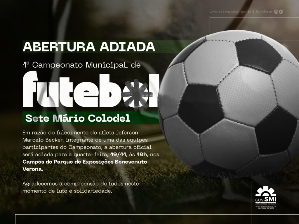 O Governo Municipal de São Miguel do Iguaçu, por meio da Secretaria de Cultura e Esporte, informa o adiamento da abertura oficial do 1º Campeonato Municipal de Futebol Sete Mário Colodel. A decisão foi tomada em razão do falecimento do atleta Jeferson Marcelo Becker, integrante de uma das equipes inscritas na competição. Em respeito à família, amigos e à memória do atleta, a administração municipal e a organização do campeonato optaram por suspender as atividades previstas para esta segunda-feira. A abertura oficial fica remarcada para a quarta-feira, dia 19 de novembro, às 19h00, nos campos do Parque de Exposições Benevenuto Verona. O Governo Municipal manifesta solidariedade aos familiares e amigos neste momento de dor e luto, e agradece a compreensão de toda a comunidade esportiva. ASSESSORIA DE IMPRENSA
