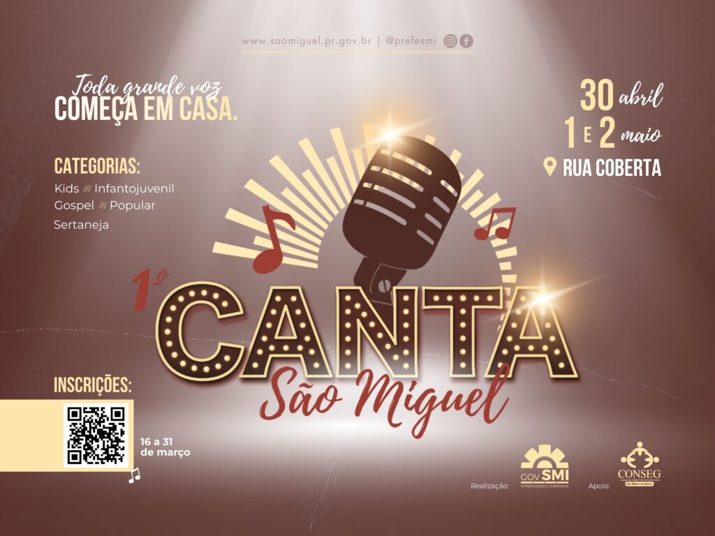 O Governo Municipal de São Miguel do Iguaçu vai promover a 1ª edição do Canta São Miguel – Festival Municipal de Música, iniciativa que passa a integrar o calendário cultural do município com o objetivo de valorizar e incentivar talentos locais. A programação será realizada nos dias 30 de abril e 01 e 02 de maio, na Rua Coberta Addy Cavalca, com entrada gratuita. O festival é uma realização do Governo Municipal, por meio da Secretaria de Cultura e Esporte, em parceria com o Conselho Municipal de Segurança de São Miguel do Iguaçu (CONSEG), e tem como objetivo incentivar a música, revelar novos artistas e fortalecer a cultura no município. As inscrições estarão abertas de 16 a 31 de março e poderão ser realizadas presencialmente no Departamento de Cultura, localizado na Rua Garibaldi, nº 268, Centro, ou pelo WhatsApp (45) 3565-8147, desde que a ficha de inscrição possa ser assinada digitalmente. O atendimento acontece das 07h30 às 11h30 e das 13h00 às 17h00. O festival contará com cinco categorias: – Kids – de 05 a 11 anos (estilo livre); – Infanto-Juvenil – de 12 a 16 anos (estilo livre); – Gospel; – Sertanejo; – Popular. Podem participar intérpretes residentes ou domiciliados em São Miguel do Iguaçu há pelo menos seis meses, nas modalidades solo, dupla, trio ou quarteto. Cada candidato poderá se apresentar com apenas uma música e em uma única categoria. Não poderão se inscrever participantes que possuam carreira profissional reconhecida ou contrato com gravadora. Menores de idade deverão estar acompanhados pelos pais ou responsáveis, sendo que candidatos entre 16 e 18 anos incompletos deverão apresentar autorização assinada. As apresentações eliminatórias ocorrerão nos dias 30 de abril e 01 de maio, a partir das 19h30, enquanto a grande final, com entrega da premiação, será realizada no dia 02 de maio, a partir das 20h00. Durante as apresentações, os intérpretes serão acompanhados pela Banda Zatter, sendo proibida a utilização de playback. Serão premiados os sete mais bem colocados em cada categoria, com valores em dinheiro e troféus. Categorias Gospel, Sertanejo e Popular 1º lugar – R$ 1.000,00 + troféu 2º lugar – R$ 850,00 + troféu 3º lugar – R$ 750,00 + troféu 4º lugar – R$ 650,00 + troféu 5º lugar – R$ 550,00 + troféu 6º lugar – R$ 450,00 + troféu 7º lugar – R$ 350,00 + troféu Categoria Infanto-Juvenil 1º lugar – R$ 700,00 + troféu 2º lugar – R$ 600,00 + troféu 3º lugar – R$ 500,00 + troféu 4º ao 7º lugar – R$ 300,00 + troféu Categoria Kids 1º lugar – R$ 500,00 + troféu 2º lugar – R$ 400,00 + troféu 3º lugar – R$ 300,00 + troféu 4º ao 7º lugar – R$ 200,00 + troféu Outro destaque do festival é que os primeiros colocados das categorias Infanto-Juvenil, Gospel, Sertanejo e Popular irão representar São Miguel do Iguaçu no Festival Regional dos Municípios do Oeste do Paraná (FERMOP). O prefeito Boaventura Motta destacou que o festival reforça o compromisso da administração municipal com a valorização da cultura e a abertura de espaços para artistas locais. “São Miguel do Iguaçu tem muitos talentos e queremos criar cada vez mais oportunidades para que eles possam se apresentar e mostrar o seu potencial. O Canta São Miguel nasce para fortalecer a cultura, incentivar a música e promover momentos especiais de integração para toda a comunidade”, afirmou. ASSESSORIA DE IMPRENSA