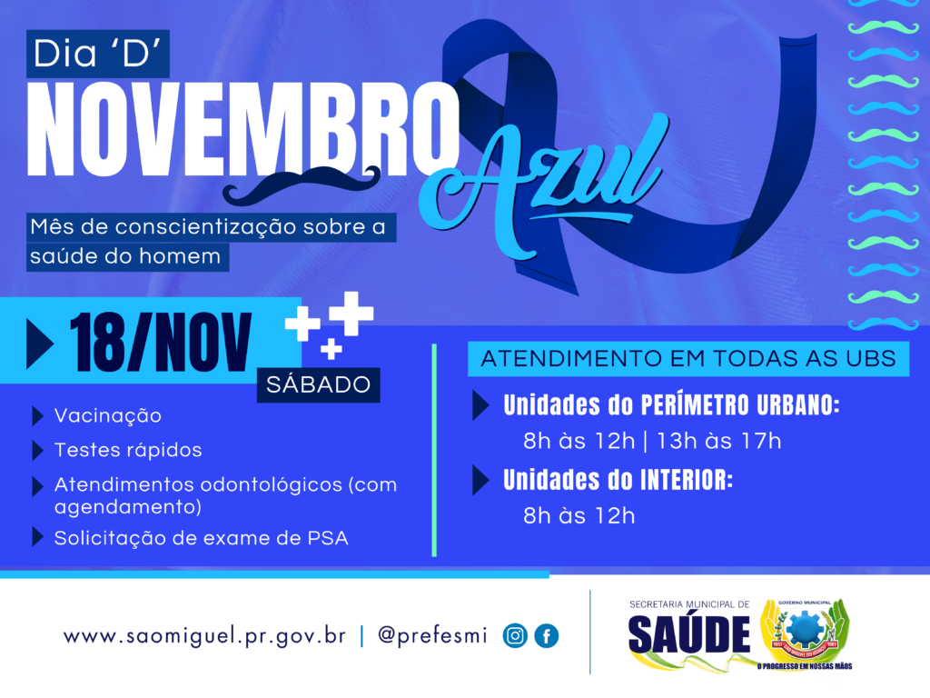 O Governo Municipal de São Miguel do Iguaçu, por intermédio da Secretaria de Saúde, vai realizar no próximo dia 18 de novembro, um sábado, o ‘Dia D’ do Novembro Azul, com ações de vacinação, atendimentos odontológicos, testes rápidos para os homens e, se for o caso, solicitação de exame de PSA. A ação faz parte da programação alusiva ao mês de conscientização a respeito de doenças masculinas, com ênfase na prevenção e no diagnóstico precoce do câncer de próstata (Novembro Azul). O atendimento neste dia será realizado em todas as Unidades Básicas de Saúde do município. As unidades do perímetro urbano estarão abertas das 08h00 às 12h00 e das 13h00 às 17h00 e as do interior no horário das 08h00 às 12h00. A aplicação das vacinas e testes rápidos serão realizados por ordem de chegada e os atendimentos odontológicos conforme agendamento prévio, que pode ser efetuado nas próprias Unidades de Saúde. De acordo com especialistas, o Sistema de Informação sobre Mortalidade e dos Registros de Câncer de Base Populacional estima que, para o triênio 2023-2025, são esperados 704 mil casos novos de câncer no Brasil. O câncer de próstata é um dos mais incidentes, com 71.730 mil casos novos, correspondendo a um risco estimado de 67,86 casos a cada 100 mil homens. Além do Dia D, outras ações de prevenção serão realizadas o longo do mês. A secretária de Saúde, Adriana da Silva Motta, convoca os homens para participar das ações, pois a prevenção é fundamental. “A prevenção salva vidas”, destacou. ASSESSORIA DE COMUNICAÇÃO, IMPRENSA E MIDIA SOCIAL