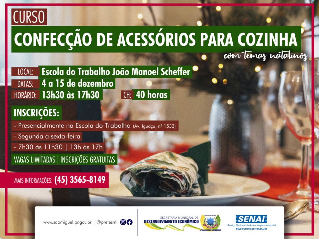 O Governo Municipal de São Miguel do Iguaçu, por meio da secretaria de Desenvolvimento Econômico, e o Serviço Nacional de Aprendizagem Industrial (Senai) estão com inscrições abertas para o curso ‘Confecção de Acessórios para Cozinha’. O curso será ministrado na Escola do Trabalho João Manoel Scheffer, entre os dias 04 a 15 de dezembro de 2023, no horário das 13h30 as 17h30, totalizando uma carga horária de 40 horas. As vagas são limitadas e as inscrições, gratuitas, podem ser realizadas na própria Escola do Trabalho, localizada na Avenida Iguaçu, nº1533, de segunda à sexta-feira, das 07h30 às 11h30 e das 13h00 às 17h00. Para realizar a inscrição são necessários os seguintes documentos: • Cópia certidão de nascimento ou casamento • Cópia cédula de identidade • Cópia CPF • Cópia comprovante de matrícula ou histórico escolar do fundamental I • Cópia comprovante de residência atualizado • Cópia RNE – para estrangeiros Os conteúdos serão: jogo americano; avental; guardanapo, capas em geral, guardanapo com barrado; pano de prato, como tirar medidas; cálculo de custo; e preço de venda. Todos com temas natalinos. Mais informações podem ser obtidas pelo telefone (45) 3565-8149. ASSESSORIA DE COMUNICAÇÃO, IMPRENSA E MIDIA SOCIAL