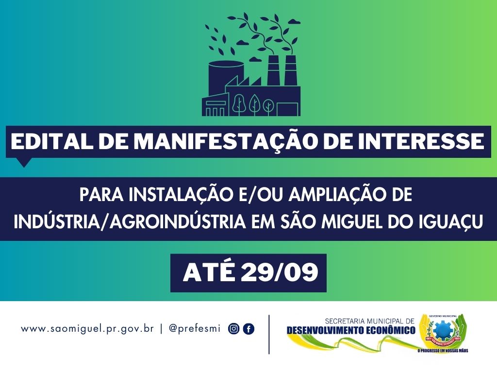 O Governo Municipal de São Miguel do Iguaçu publicou no Diário Oficial Eletrônico (DOE) o edital de manifestação de interesse para instalação e/ou ampliação de indústria/agroindústria no município, que visa mapear a demanda e incentivar a geração de empregos e renda. O objetivo é impulsionar a instalação e ampliação de empresas no município. A iniciativa busca quantificar a necessidade de investidores dispostos a empreender em novas atividades ou expandir suas operações industriais e/ou agroindustriais em São Miguel do Iguaçu. Essas informações serão utilizadas para a formulação de políticas públicas voltadas ao bem-estar social, com foco na criação de oportunidades de emprego. O possível incentivo por parte da Administração Municipal poderá ser realizado por meio da facilitação na aquisição ou concessão de terrenos públicos, através da venda ou concessão de uso, visando à viabilização dos projetos que surgirem a partir desse edital. Poderão manifestar o interesse, pessoas físicas e/ou jurídicas que atuam nos segmentos industrial e/ou agroindustrial, que tenham interesse em transferir suas operações para o município, em realizar a ampliação de empresas já existentes através da realocação da sede, abertura de filial ou em iniciar novos negócios, atualmente domiciliadas ou não em São Miguel do Iguaçu. O secretário de Desenvolvimento Econômico, Valcir Teixeira, destacou que é muito importante que todos os empresários protocolem suas intenções para que sejam planejadas as ações do poder público. ‘Com essas informações será possível realizar um estudo que vai formatar as políticas públicas para instalação ou ampliação de empresas da cidade ou atrair as de fora do município que queiram empreender em São Miguel do Iguaçu’, explicou. A manifestação de interesse poderá ser realizada até o próximo dia 29 de setembro, no horário das 07h30 às 11h30 e das 13h00 as 17h00, mediante protocolo junto ao Setor de Protocolo do Paço Municipal, localizado na Rua Vanio Ghellere, 64, Centro. Cada CPF ou CNPJ terá direito a uma única manifestação de interesse. Mais detalhes sobre os procedimentos e critérios estão disponíveis na edição nº 3215 do DOE, publicada na segunda-feira, dia 14. ASSESSORIA DE COMUNICAÇÃO, IMPRENSA E MIDIA SOCIAL