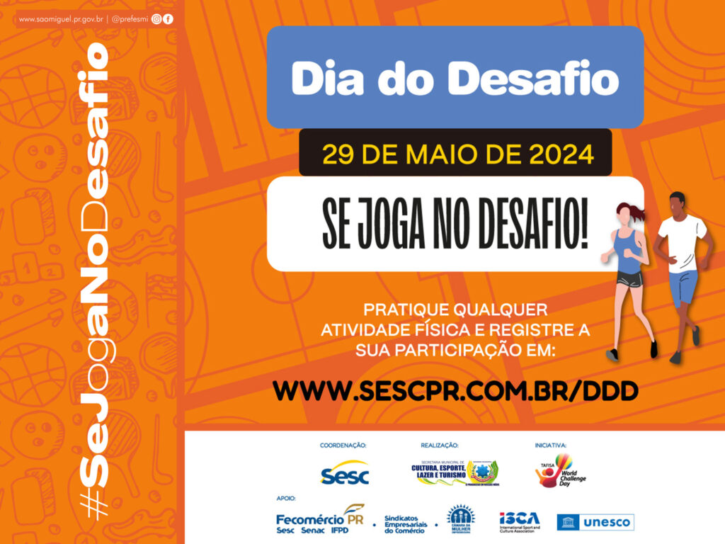 O município de São Miguel do Iguaçu irá participar, nesta quarta-feira, 29 de maio, da 30ª edição do Dia do Desafio, com diversas atividades coordenadas pela Secretaria de Cultura, Esporte, Lazer e Turismo. O Dia do Desafio é uma campanha mundial de incentivo à prática de esportes e atividades físicas, realizada por instituições públicas e privadas em 14 países da América Latina. Nesta edição o tema é “Se Joga no Desafio”, e está divido em três eixos: Movimento Cidades Saudáveis da Organização Mundial de Saúde, Promoção dos conceitos de Atividade Física Recreativa e Utilitária e Modais de Locomoção (caminhar, correr e pedalar). Dessa forma, a campanha reforça seu empenho em possibilitar a experimentação de diferentes práticas físico-esportiva e contribuir com a melhoria da qualidade de vida da população. Neste dia, a população é convidada a praticar qualquer atividade física por, pelo menos, 15 minutos. Os professores que atuam na secretaria e escolas serão orientados para que apliquem atividades e registrem com vídeos. “Será realizado atividade lúdica em todas as modalidades além de projetos da secretaria de saúde e esportes e registrados com fotos e pequenos vídeos. Será realizado ainda no período da manhã as 09h30 uma ginástica laboral na prefeitura”, informou o Secretário de Cultura, Esporte, Lazer e Turismo, Aldatro de Góes. O evento é coordenado pelo Serviço Social do Comércio (SESC/PR) e Governo Municipal, com o apoio da Fecomércio-PR e Unesco. ASSESSORIA DE COMUNICAÇÃO, IMPRENSA E MIDIA SOCIAL