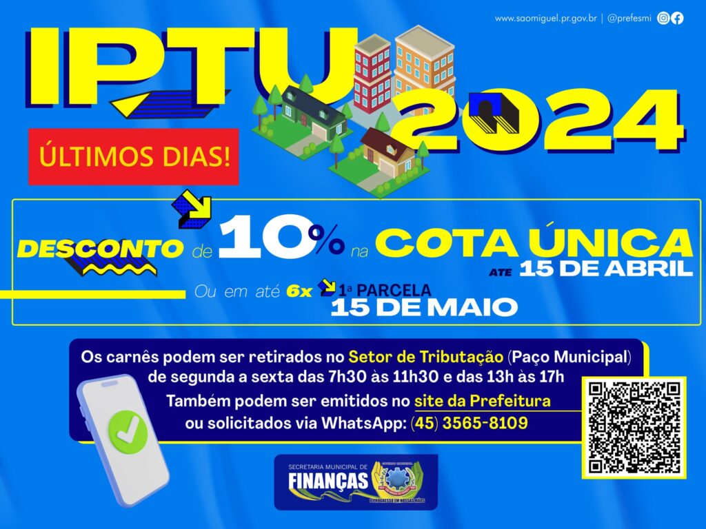 O Governo Municipal de São Miguel do Iguaçu, por meio do departamento de Tributação, vinculado à secretaria de Finanças, reforça que termina na próxima segunda-feira, 15 de abril, o prazo para o pagamento da cota única do Imposto Predial Territorial Urbano (IPTU) 2024, com 10% de desconto. A emissão dos carnês pode ser realizada online, no site da prefeitura (link disponível clicando aqui), via WhatsApp pelo telefone (45) 3565-8109 ou ainda pessoalmente no Setor de Tributação, localizado no Paço Municipal, no horário de expediente, das 07h30 às 11h30 e das 13h00 às 17h00. Para retirar na prefeitura é necessário apresentar o cadastro do imóvel, que poderá ser obtido em carnês anteriores, escritura do imóvel ou conta de água. De acordo com o secretário de Finanças, Ledenir Presa, até o momento cerca de 25% dos contribuintes já efetuaram o pagamento à vista. ‘A estimativa é de que essa porcentagem suba para 50% até o dia 15’, projetou. Caso não for pago em cota única, o IPTU 2024 poderá ser parcelado em até 06 vezes, sendo que cada parcela não poderá ser inferior a R$ 50,00, com a primeira parcela vencendo no próximo dia 15 de maio. ASSESSORIA DE COMUNICAÇÃO, IMPRENSA E MIDIA SOCIAL