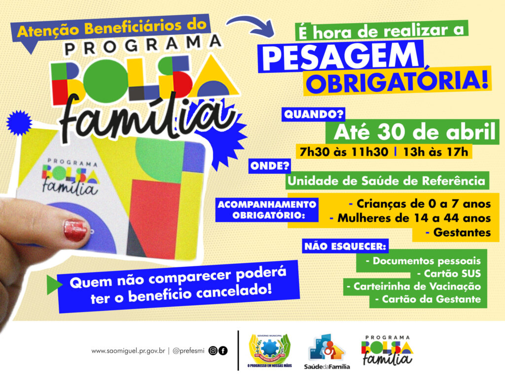 O Governo Municipal de São Miguel do Iguaçu, por meio das secretarias de Assistência Social e de Saúde, convoca os beneficiários do programa Bolsa Família à comparecerem a Unidade de Saúde mais perto de sua residência para realizar a pesagem, obrigatória para garantir o recebimento do benefício. O prazo final para realizar a pesagem é dia 30 de abril na Unidade Básica de Saúde (UBS) de sua referência. O não comparecimento poderá acarretar em bloqueio do benefício. É necessário levar documentos pessoais, carteirinha de vacinação, cartão da gestante e o cartão do SUS. O horário de atendimento das unidades é das 07h30 às 11h30 e das 13h00 às 17h00. Este acompanhamento é obrigatório para crianças de 00 a 07 anos, mulheres de 14 a 44 anos e gestantes que recebem o Bolsa Família. O objetivo da pesagem é fazer o acompanhamento nutricional dos beneficiários, verificar o cartão de vacina da criança e se a gestante beneficiária está fazendo o pré-natal. “A pesagem é obrigatória e, sem ela, os benefícios ligados ao Bolsa Família poderão ser bloqueados, suspensos ou cancelados”, explica a Agente Comunitária de Saúde e gestora do programa municipal Bolsa Família, Maria Luísa Ferreira Salbego. O pagamento do programa é de R$ 600,00 com adicional de R$ 150,00 por criança de até sete anos. Em São Miguel do Iguaçu, 1.532 pessoas recebem o benefício do Bolsa Família. Mensalmente um total de R$ 1.026.349,00 (um milhão, vinte e seis mil e trezentos e quarenta e nove reais) são repassados pelo Governo Federal para atender essas famílias. ASSESSORIA DE COMUNICAÇÃO, IMPRENSA E MIDIA SOCIAL