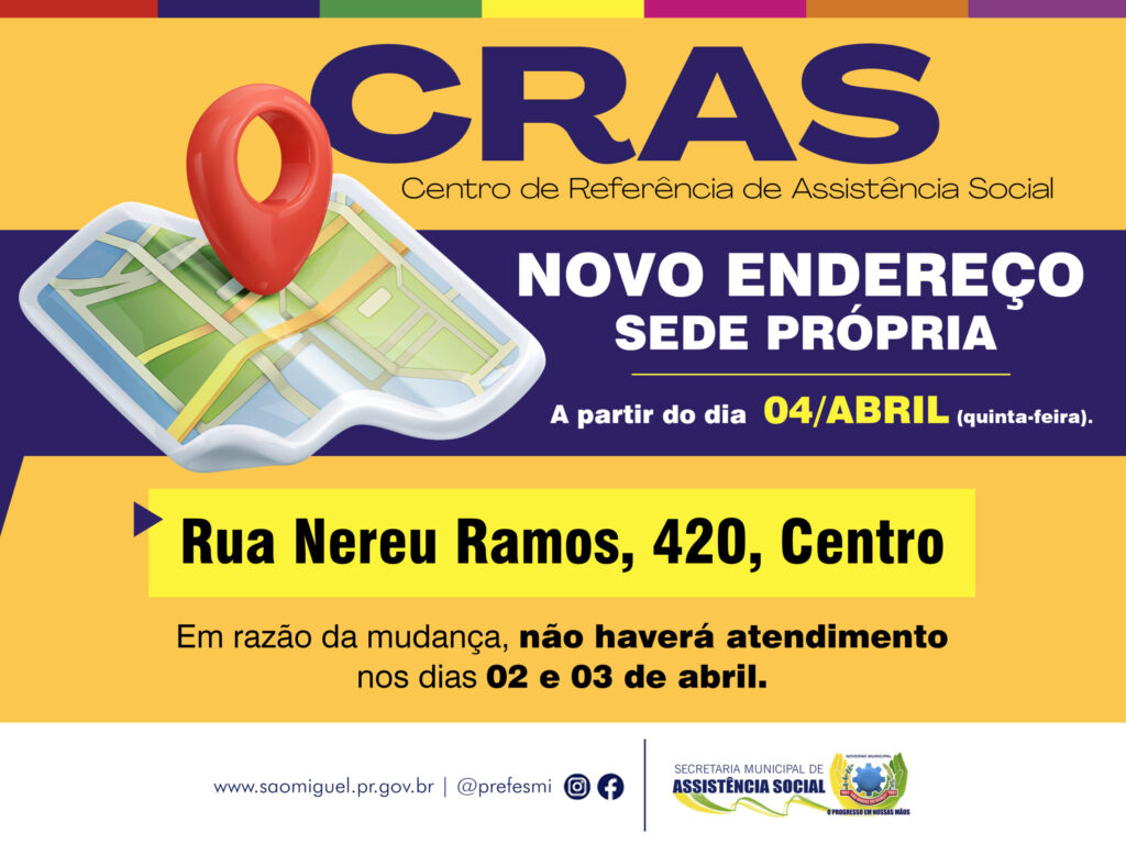 O Governo Municipal de São Miguel do Iguaçu, por intermédio da Secretaria de Assistência Social, comunica que não haverá atendimento nesta terça, 02, e quarta-feira, 03, no Centro de Referência de Assistência Social (CRAS). O motivo é a mudança para a sede própria, localizada na Rua Nereu Ramos, 420. O atendimento voltará ao normal na quinta-feira (04). O local passou por obra de melhoria e reforma com investimento da ordem de R$ 157.000,00, recursos do Índice de Gestão Descentralizada (IGD) do Governo Federal. A reforma compreendeu troca de todo o piso, pintura interna e externa, além de adequações em algumas divisórias. O CRAS realiza atendimentos, orientação e acompanhamento de famílias, ofertando benefícios, programas e serviços socioassitenciais, atendendo em média 600 indivíduos por mês. Com a reforma pretende-se melhorar toda estrutura física da unidade, ampliar a área da recepção e disponibilizar uma sala para realização de atividades em grupo. Atualmente no município de São Miguel do Iguaçu estão inscritas no Cadastro Único 5.510 famílias, totalizando 12.574 pessoas. ASSESSORIA DE COMUNICAÇÃO, IMPRENSA E MIDIA SOCIAL