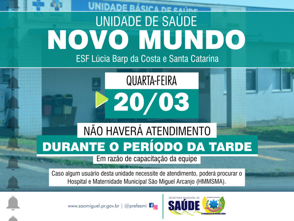 O Governo Municipal de São Miguel do Iguaçu, por meio da Secretaria de Saúde, comunica que a Unidade de Saúde do Bairro Novo Mundo, a ESF Lucia Barp da Costa, estará fechada na tarde de quarta-feira, 20, para capacitação dos servidores. A equipe de profissionais estará em Foz do Iguaçu para uma capacitação do Planifica SUS, organizada pela 9ª Regional de Saúde. Caso algum usuário desta unidade, que também atende a EFS Santa Catarina, necessite de atendimento de urgência poderá procurar o Hospital e Maternidade Municipal São Miguel Arcanjo (HMMSMA). ASSESSORIA DE COMUNICAÇÃO, IMPRENSA E MIDIA SOCIAL