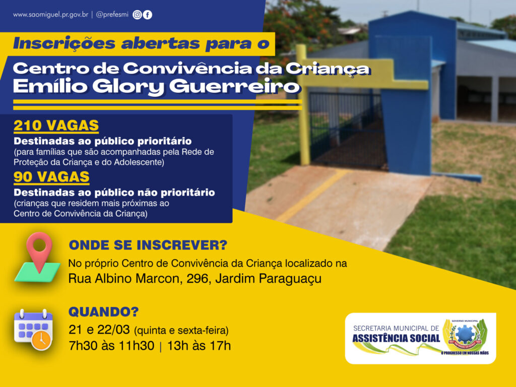 O Governo Municipal de São Miguel do Iguaçu, por intermédio da Secretaria de Assistência Social, informa que vai realizar nesta quinta e sexta-feira, dias 21 e 22 de março, as inscrições para o Centro de Convivência da Criança Emilio Glory Guerreiro, o antigo CITEL. O público total a ser atendido será de 300 crianças (150 em cada período), com idades de 4 a 12 anos, sendo que no ano de inclusão a criança complete 4 anos até 31 de março ou complete 12 anos após 30 de junho. Das vagas, 210 serão destinadas ao público prioritário, que é oriundo de famílias que são acompanhadas pela Rede de Proteção da Criança e do Adolescente por meio do CRAS, CREAS, Conselho Tutelar, etc. Estas crianças já foram encaminhadas para o Centro de Convivência da Criança e as equipes já estão entrando em contato para que as famílias realizem as inscrições. As 90 vagas restantes serão destinadas ao público não prioritário, que é formado por crianças que residem mais próximas ao Centro de Convivência da Criança (conforme o § 1º do Art. 14 da Lei nº 2.983, de 06 de dezembro de 2017). As inscrições devem ser realizadas no próprio Centro de Convivência da Criança, localizado na Rua Albino Marcon, 296, Jardim Paraguaçu, no horário das 07h30 às 11h30 e das 13h00 às 17h00. Os documentos necessários para a inscrição são: cópia do RG, CPF e Certidão de Nascimento da criança; declaração de matrícula escolar 2024; cópia do comprovante de residência; cópia do Cartão do SUS; cópia do RG e do CPF do responsável. A sede do local passou por uma reforma geral, que foi executada em uma área de aproximadamente 927 m² e teve um investimento de R$ 924.454,20 (novecentos e vinte e quatro mil, quatrocentos e cinquenta e quatro reais e vinte centavos), com recursos próprios do município. A reinauguração será realizada no dia 27 de março, às 15h00, e o início das atividades e dos atendimentos às crianças está previsto para o dia 01 de abril. ASSESSORIA DE COMUNICAÇÃO, IMPRENSA E MIDIA SOCIAL