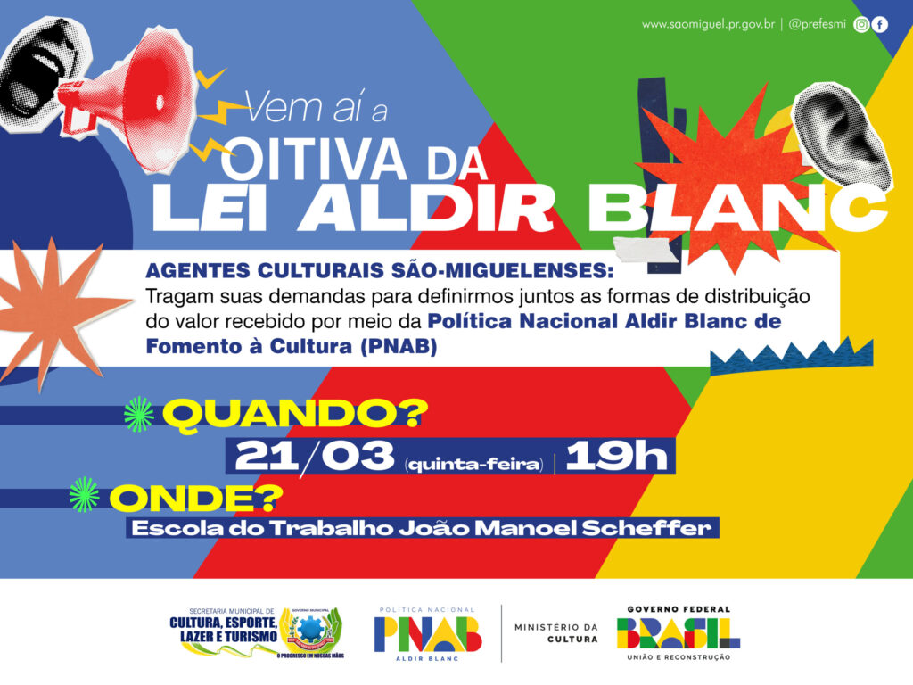 O Governo Municipal de São Miguel do Iguaçu, por intermédio da Secretaria de Cultura, Esporte, Lazer e Turismo, vai realizar na próxima quinta-feira, 21, uma oitiva para apresentar a Lei Aldir Blanc 2 aos agentes culturais do município. O encontro será realizado na Escola do Trabalho João Manoel Scheffer, a partir das 19h00. São Miguel do Iguaçu recebeu R$ 233.932,16 por meio da Política Nacional Aldir Blanc de Fomento à Cultura (PNAB), do Ministério da Cultura, e vai ouvir os envolvidos com a cultura do município para definir as formas de distribuição desse valor para os diversos setores através de chamamentos públicos. ‘O principal intuito é explicar o objetivo desta lei, que vai seguir até 2027, e ouvir a demanda do setor cultural do município para assim serem montados os editais’, explicou o secretário de Cultura, Esporte, Lazer e Turismo, Adaltro de Góes. A Lei Aldir Blanc foi criada em 2020 com o propósito principal de proporcionar apoio aos trabalhadores da cultura, bem como à manutenção de territórios e espaços culturais cujas atividades foram prejudicadas pela pandemia do novo coronavírus. Em 2022 ela foi ampliada, por meio da Lei nº 14.399/2022, não sendo mais emergencial, mas sim transformada em uma política de fomento à produção cultural. ASSESSORIA DE COMUNICAÇÃO, IMPRENSA E MIDIA SOCIAL