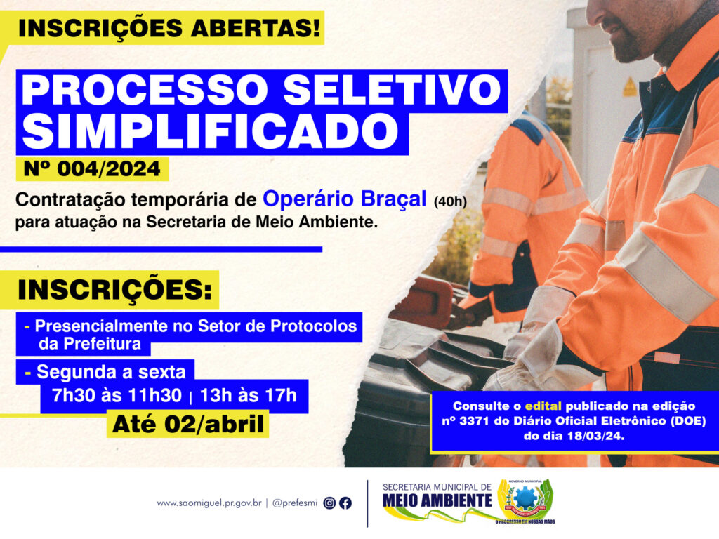 O Governo Municipal de São Miguel do Iguaçu está com inscrições abertas para o Processo Seletivo Simplificado (PSS) nº 004/2024, que visa à contratação, por tempo determinado, de operário braçal para atuação na Secretaria de Meio Ambiente. As inscrições são gratuitas e podem ser realizadas até o dia 02 de abril de 2024 no Setor de Protocolos do Paço Municipal, no horário de expediente da prefeitura, sendo das 07h30 as 11h30 e das 13h00 as 17h00. Para a inscrição, o candidato deverá comparecer pessoalmente ou por intermédio de procurador munido de instrumento público ou particular com firma reconhecida em cartório com poderes específicos e deverá entregar cópia dos documentos pessoais e referentes à comprovação dos títulos e experiência profissional, bem como os Anexos I e II do edital devidamente preenchidos e assinados. Estão abertas 05 vagas de ampla concorrência, uma vaga para pessoa com deficiência (PcD) e uma vaga indígena, mais cadastro de reserva, para candidatos com nível de formação de Ensino Fundamental Incompleto. A jornada de trabalho será de 40 horas semanais e o vencimento mensal será de R$ 1.863,07 (um mil oitocentos e sessenta e três reais e sete centavos). Além do salário, o contratado fará jus aos direitos previstos na Consolidação da Lei do Trabalho–CLT. O operário braçal atuará junto à Secretaria de Meio Ambiente executando serviços rotineiros de limpeza pública em geral e manutenção integrada; além de tarefas auxiliares nas áreas de serviços de limpeza, outras áreas de manutenção e conservação em logradouros de domínio público, entre outros previstos em edital. Todos os detalhes do PSS nº 004/2024 estão disponíveis na edição nº 3371 do Diário Oficial Eletrônico (DOE) publicada na segunda-feira, 18. ASSESSORIA DE COMUNICAÇÃO, IMPRENSA E MIDIA SOCIAL