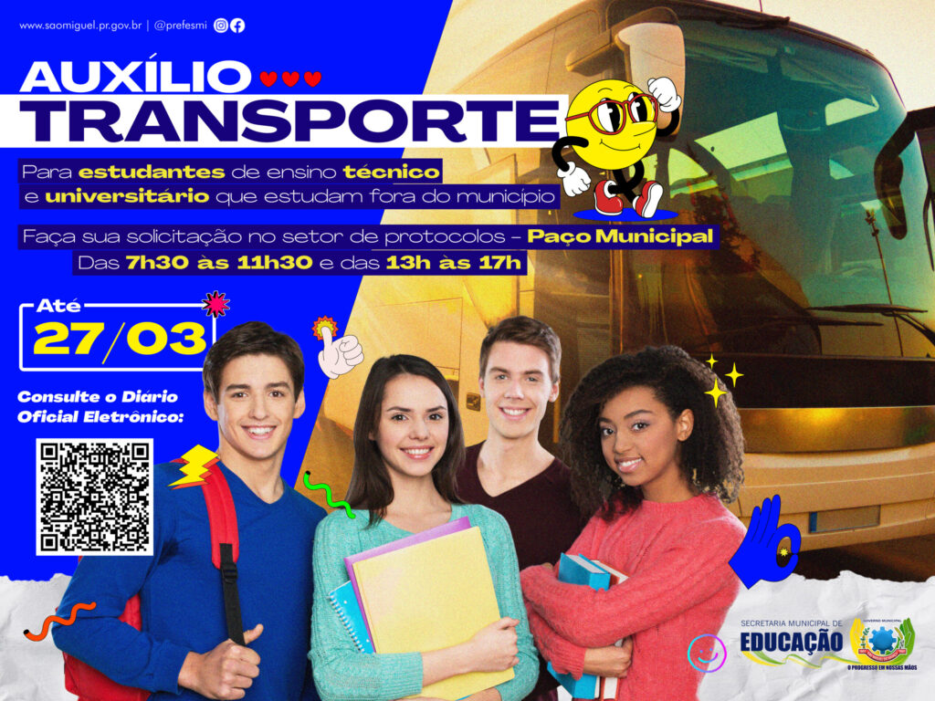 O Governo Municipal de São Miguel do Iguaçu, por meio da secretaria de Educação, lançou o chamamento público para concessão de auxílio transporte para estudantes de ensino técnico e universitário que estudam fora do município. A solicitação dos candidatos interessados deve ser realizada via protocolo, no setor de protocolos no Paço Municipal, até o dia 27 de março de 2024, no horário das 07h30 às 11h30 e das 13h00 às 17h00. Para concessão e manutenção do auxílio, o beneficiário deverá atender os requisitos que estão no edital publicado no Diário Oficial Eletrônico do dia 07/03/2023 e preencher a ficha de cadastro. Entre os requisitos estão: ser residente de São Miguel do Iguaçu (mediante comprovante de residência), estar matriculado em curso presencial não ofertado por instituição de ensino local, ter frequência e notas mínimas cumpridas no trimestre, entre outras exigências. A presidente da Comissão Municipal de análise do programa, Eliete Maria Bortoluzzi, relatou que o valor do benefício será de R$ 236,40(duzentos e trinta e seis reais e quarenta centavos), com início a partir do mês de fevereiro de 2024. “É muito importante que os estudantes que se enquadram no programa realizem o cadastro o quanto antes para garantirem o seu auxílio, pois existe um limite orçamentário”. O pagamento das parcelas do primeiro semestre será realizado final do mês de junho de 2024, em parcela única. ASSESSORIA DE COMUNICAÇÃO, IMPRENSA E MIDIA SOCIAL