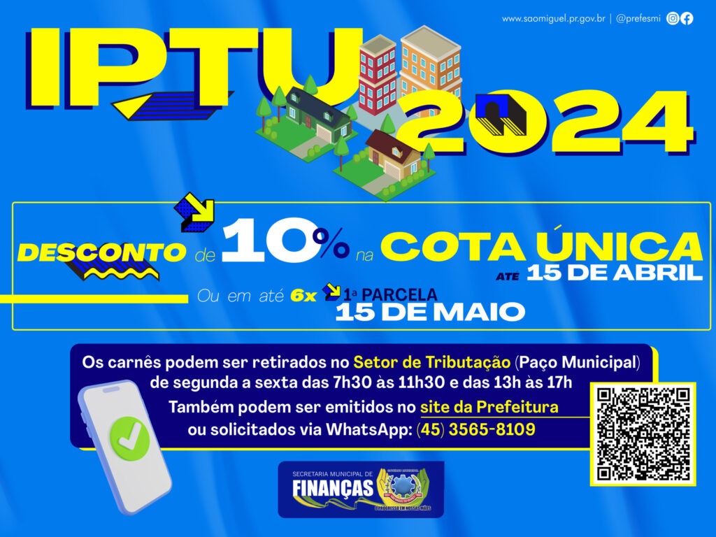 O Governo Municipal de São Miguel do Iguaçu, por meio do departamento de Tributação, vinculado à secretaria de Finanças, comunica que os carnês do Imposto Predial Territorial Urbano (IPTU) 2024 já estão disponíveis para retirada ou emissão online. O contribuinte pode realizar a emissão online no site da prefeitura (link disponível clicando aqui), solicitar via WhatsApp pelo telefone (45) 3565-8109 ou ainda retirar pessoalmente no Setor de Tributação, localizado no Paço Municipal, no horário de expediente, das 07h30 às 11h30 e das 13h00 às 17h00. Para retirar na prefeitura é necessário apresentar o cadastro do imóvel, que poderá ser obtido em carnês anteriores, escritura do imóvel ou conta de água. O pagamento do IPTU poderá ser realizado em cota única com 10% de desconto para os imóveis sem débitos em aberto e vencimento no dia 15 de abril de 2024 ou poderá ser parcelado em até 06 vezes, sendo que cada parcela não poderá ser inferior a R$ 50,00, com a primeira parcela vencendo no próximo dia 15 de maio. Atualmente, São Miguel do Iguaçu tem cerca de 14 mil imóveis e lotes cadastrados. ASSESSORIA DE COMUNICAÇÃO, IMPRENSA E MIDIA SOCIAL