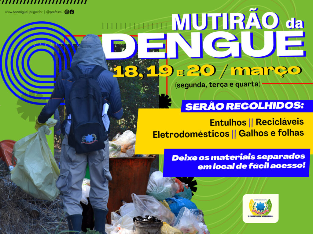 O Governo Municipal de São Miguel do Iguaçu vai realizar no início da próxima semana um ‘Mutirão da Dengue’ em todo o território urbano do município visando combater os focos do mosquito Aedes Aegypti. Equipes das diversas secretarias municipais e das subprefeituras foram convocadas a atuar em toda a cidade realizando a recolha de diversos materiais na segunda, terça e quarta-feira, dias 18, 19 e 20 de março. Para colaborar com a ação, toda a população está sendo convocada a aproveitar o final de semana e realizar uma limpeza geral em seus lotes e terrenos e colocar os materiais que serão recolhidos em frente as suas residências, devidamente separados, em local de fácil acesso. O prefeito Boaventura Motta, pediu a colaboração de todos os munícipes, destacando que pequenas ações podem fazer a diferença. ‘A situação da dengue está muito preocupante. Temos quase 300 casos confirmados. Além disso, tem também o problema de outros insetos e animais, como o escorpião amarelo. Por isso, pedimos a colaboração de todos. Se cada um fizer sua parte, vamos eliminar esse mosquito!’, relatou. Durante o mutirão, serão recolhidos diversos materiais como: entulhos (resíduos de construção, cerâmicas, vasos, entre outros); recicláveis (garrafas, lonas, PVC, pneus, recipientes plásticos ou de vidro, tábuas e madeiras); eletrodomésticos (lavadoras, TV’s, geladeiras e aparelhos eletrônicos em geral), além de galhos e folhas. As folhas e galhos deverão estar ensacados, os móveis desmontados e os recicláveis e eletrônicos acondicionados em caixas ou sacos. AUMENTO DE CASOS Segundo o Boletim Semanal divulgado na última quarta-feira, 13, já foram confirmados 283 casos de dengue no município, sendo destes, 2 de Dengue com Sinais de Alarme (DSA). Somente na última semana foram 92 novas confirmações. Ao todo, no ano epidemiológico, que iniciou em agosto de 2023 e segue até julho de 2024, foram registradas 1.695 notificações da doença. Além dos 283 confirmados, 1.069 foram negativos e 343 continuam em investigação, aguardando resultado. No mesmo período epidemiológico, também foram confirmados 03 casos positivo de chikungunya. Do total de 09 notificações, 06 foram descartadas. VACINAÇÃO O município está realizando a vacinação contra dengue para crianças de 10 a 14 anos. A vacina está disponível em 07 Unidades Básicas de Saúde (UBS) do município: Urbana: ESF Gaúcha; Panorama (ESF Manoel Nicolau Bauer e Santo Antônio); Novo Mundo (ESF Lúcia Barp da Costa e Santa Catarina); Central (ESF Central Rosa Rosanelli Boles, Ipiranga e Paraguaçu); Interior: ESF São Jorge; ESF Bruno Alfredo Boufleuer (Santa Rosa) ESF Aurora do Iguaçu. O horário de atendimento das Salas de Vacinas é das 08h00 às 11h00 e das 13h00 às 16h30. Nas terças e quintas-feiras a sala de vacinação da UBS Central tem horário estendido de atendimento até às 19h00. O esquema vacinal é composto por duas doses com intervalo de três meses entre elas. A Qdenga é uma vacina tetravalente que protege, portanto, contra os quatro sorotipos do vírus da dengue (DENV-1, DENV-2, DENV-3 e DENV-4). Para receber o imunizante é indispensável à presença dos pais ou responsáveis legais que garantirá não apenas o cumprimento dos protocolos, mas também um ambiente seguro e confiável para as crianças durante o processo de imunização. ASSESSORIA DE COMUNICAÇÃO, IMPRENSA E MIDIA SOCIAL