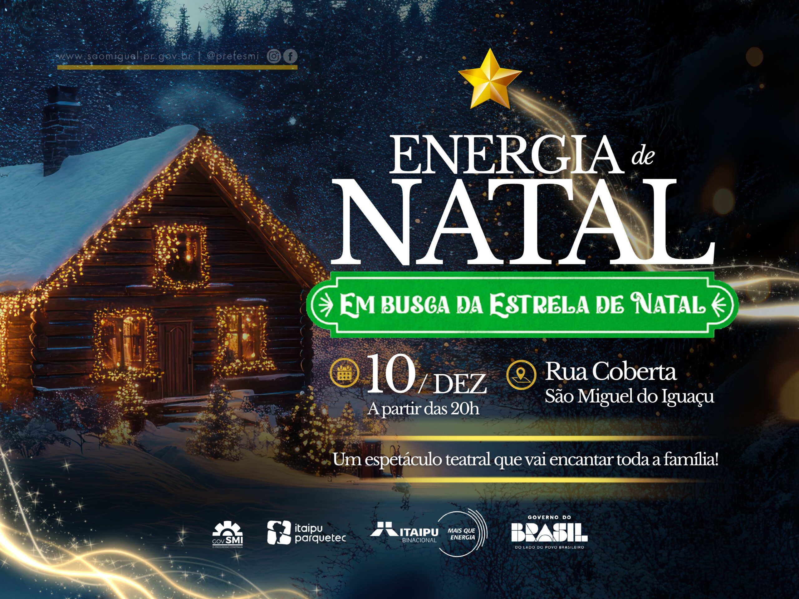 São Miguel do Iguaçu vai receber, no próximo dia 10 de dezembro, o espetáculo “Energia de Natal – Em Busca da Estrela de Natal”, a partir das 20h00, na Rua Coberta Addy Cavalca. O evento é promovido pela Itaipu Binacional e pelo Itaipu-Parquetec, em parceria com o Governo Municipal, por meio da Secretaria de Cultura e Esporte, e chega ao município pelo terceiro ano consecutivo.