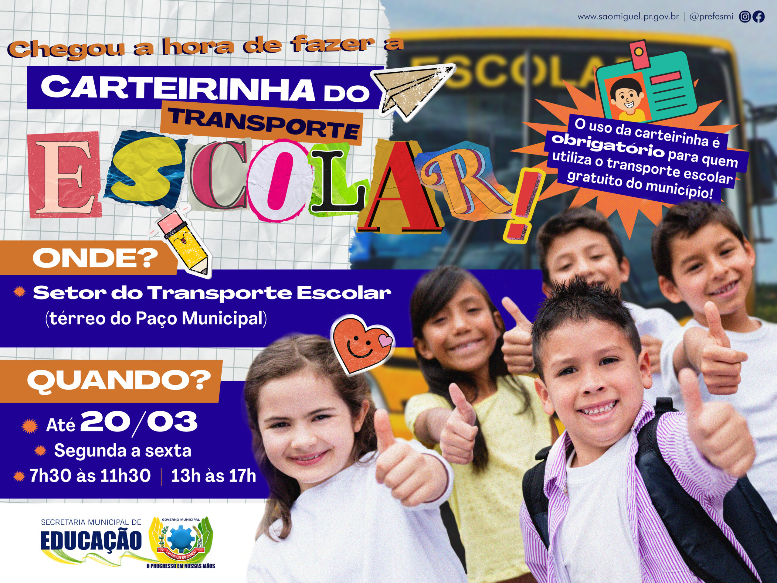 O Governo Municipal de São Miguel do Iguaçu, por intermédio da Secretaria de Educação, comunica aos estudantes que utilizam o transporte escolar do município que devem confeccionar as novas carteirinhas.