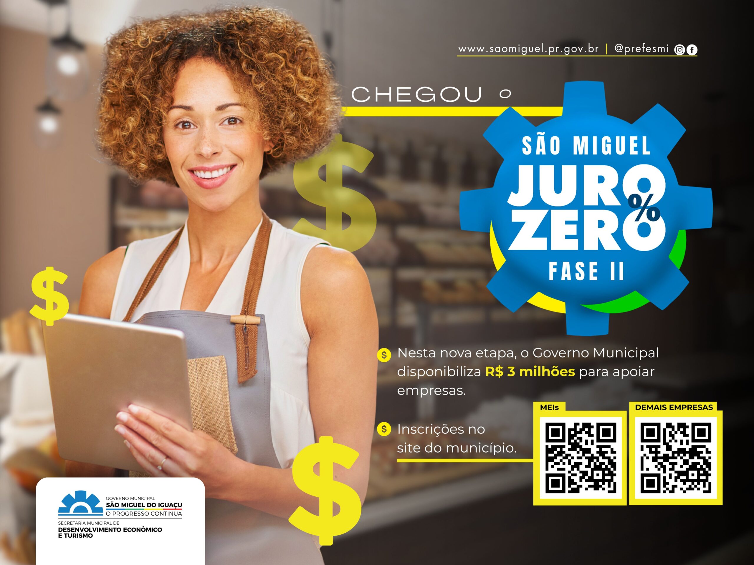 O Governo Municipal de São Miguel do Iguaçu, por meio da Secretaria de Desenvolvimento Econômico e Turismo, está disponibilizando R$ 3 milhões para a Fase II do programa ‘São Miguel Juro Zero’, lançada na quinta-feira, 26, com a publicação no Diário Oficial Eletrônico (DOE).