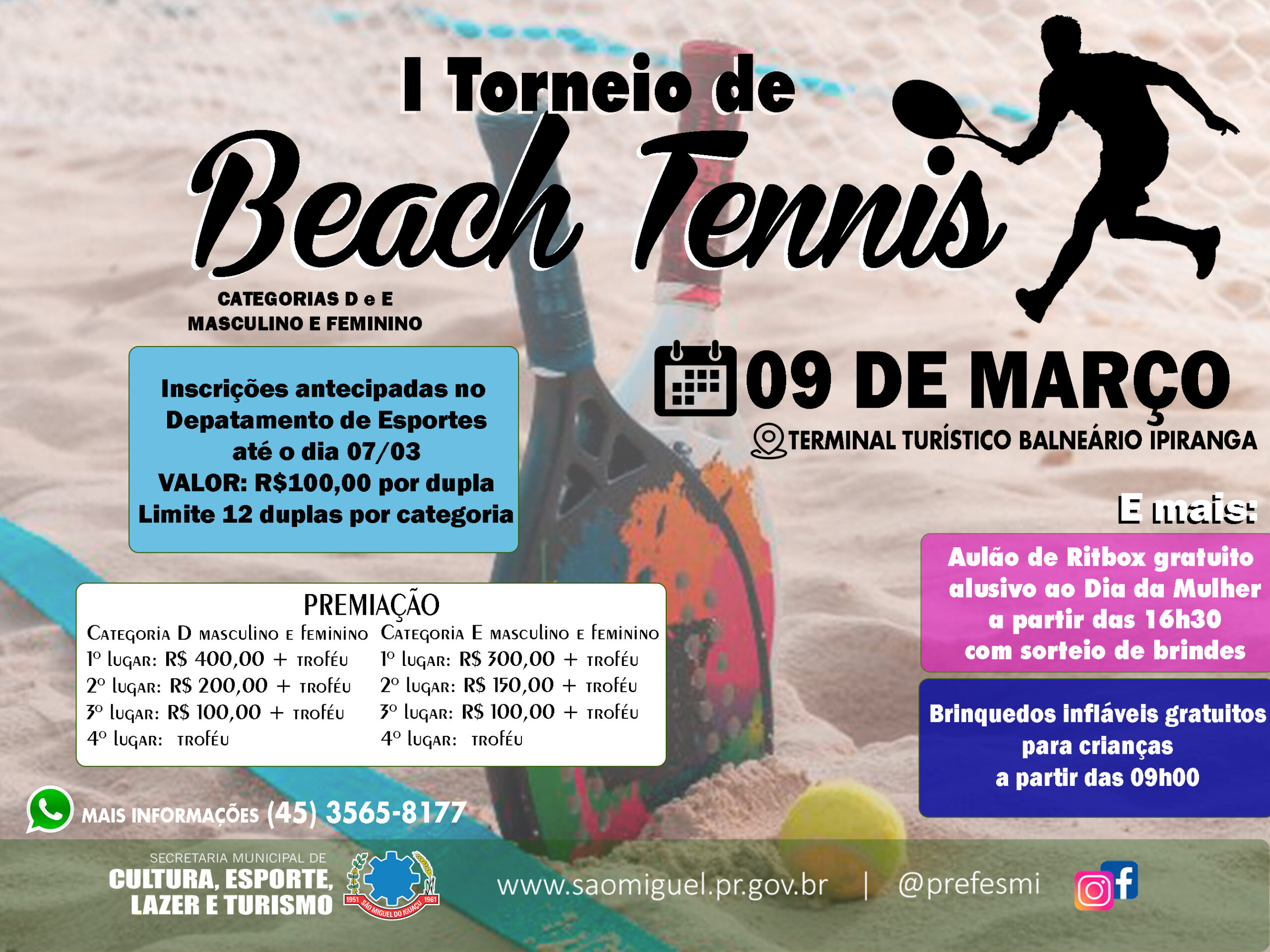 O Governo Municipal de São Miguel do Iguaçu, por meio da Secretaria de Cultura, Esporte, Lazer e Turismo, vai realizar no próximo dia 09 de março, um domingo, o 1º Torneio de Beach Tennis, no Terminal Turístico Balneário Ipiranga.