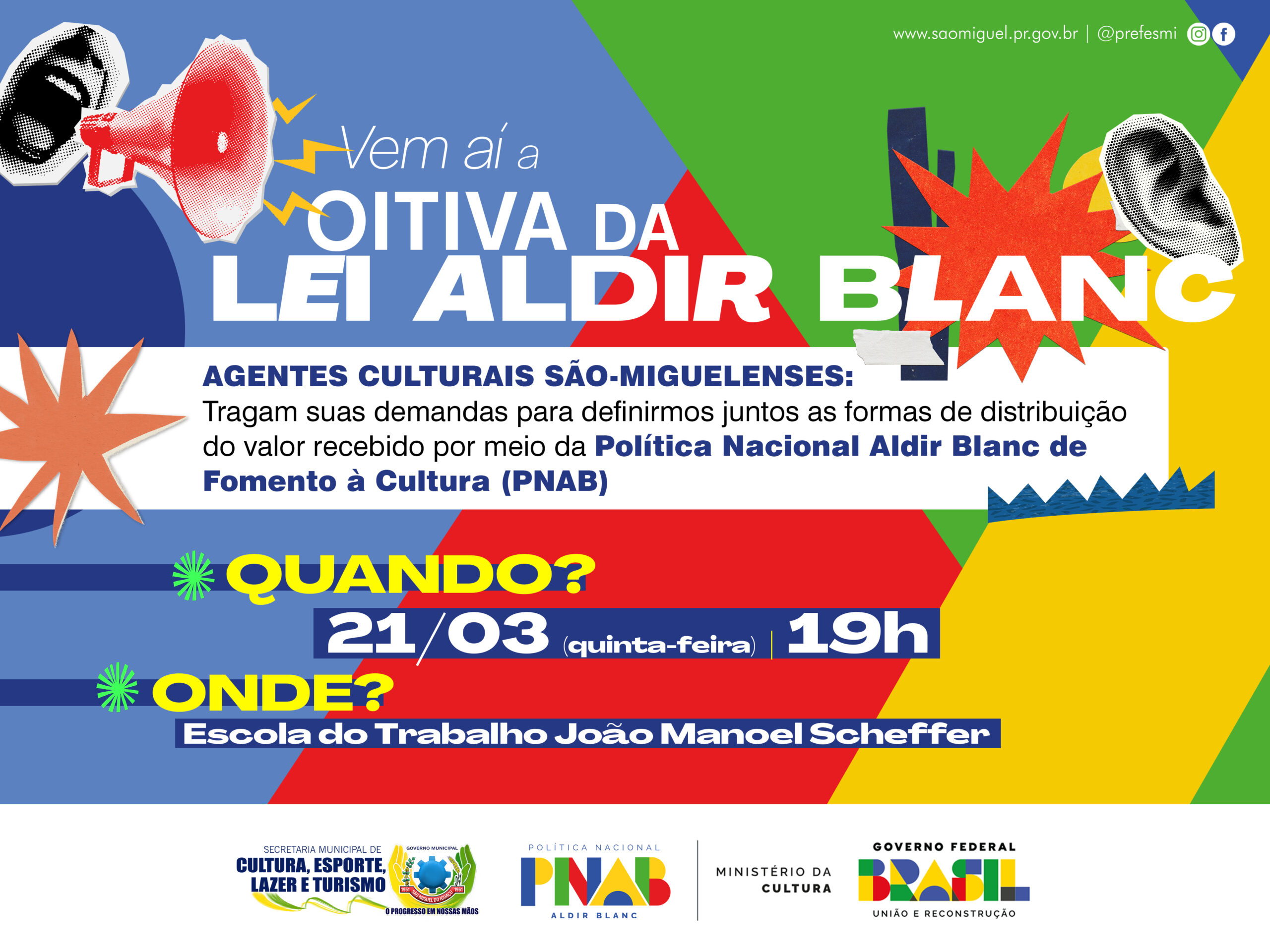 O Governo Municipal de São Miguel do Iguaçu, por intermédio da Secretaria de Cultura, Esporte, Lazer e Turismo, vai realizar na próxima quinta-feira, 21, uma oitiva para apresentar a Lei Aldir Blanc 2 aos agentes culturais do município. O encontro será realizado na Escola do Trabalho João Manoel Scheffer, a partir das 19h00.