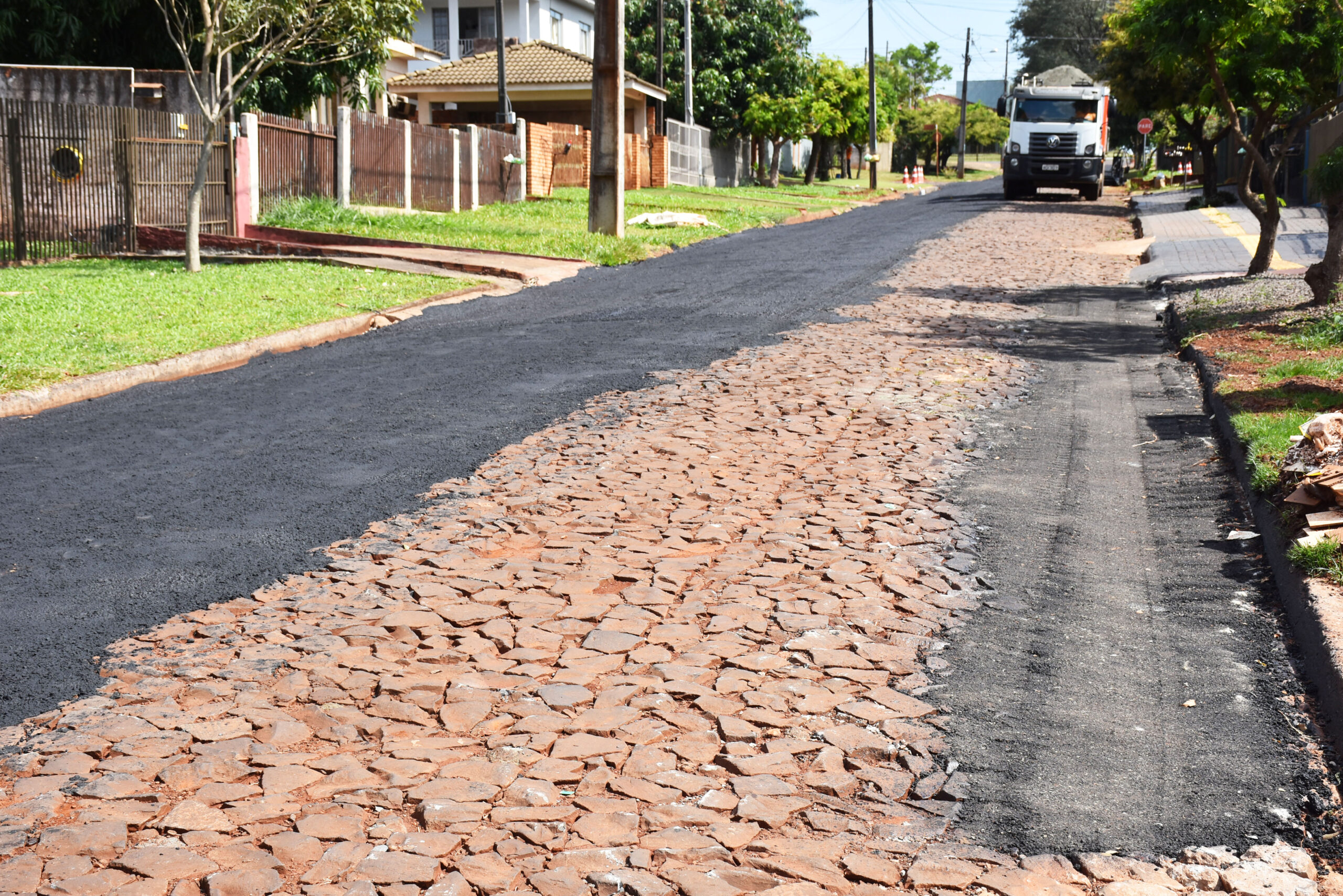 O senhor Francisco Fernandes Cavalheiro, morador do bairro há 12 anos, foi acompanhar de perto o trabalho do caminhão e relatou a alegria em ver a demanda antiga ser atendida. ‘Estamos todos muito felizes. A rua estava péssima, era ruim para passar de carro e a pé também. Teve caso de até tropeçar nas pedras e machucar o pé. Mas, agora vai ficar muito bom’, comemorou.