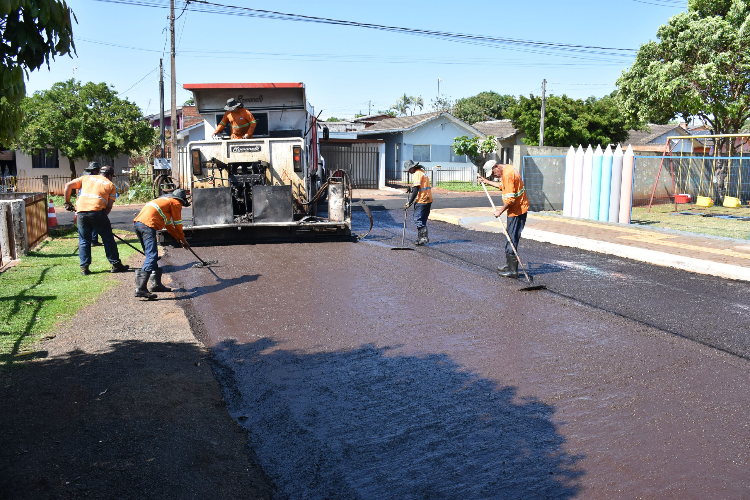 Os trabalhos foram iniciados nas ruas com pavimentação poliédrica, nas proximidades do CMEI Carolina Barela e do CMEI Maridi Mendes Leandro e se estendem pelos demais quarteirões do bairro.
