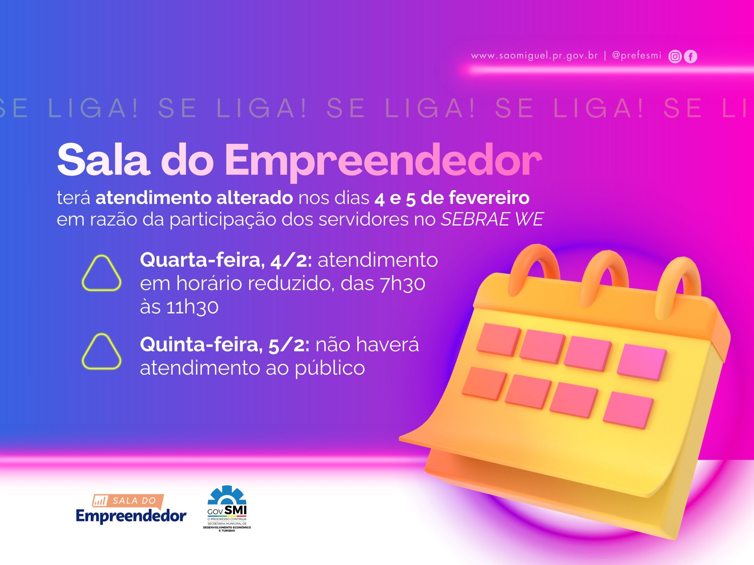 O Governo Municipal de São Miguel do Iguaçu, por meio da Secretaria de Desenvolvimento Econômico e Turismo, informa que a Sala do Empreendedor do município terá alteração no atendimento nos dias 04 e 05 de fevereiro.