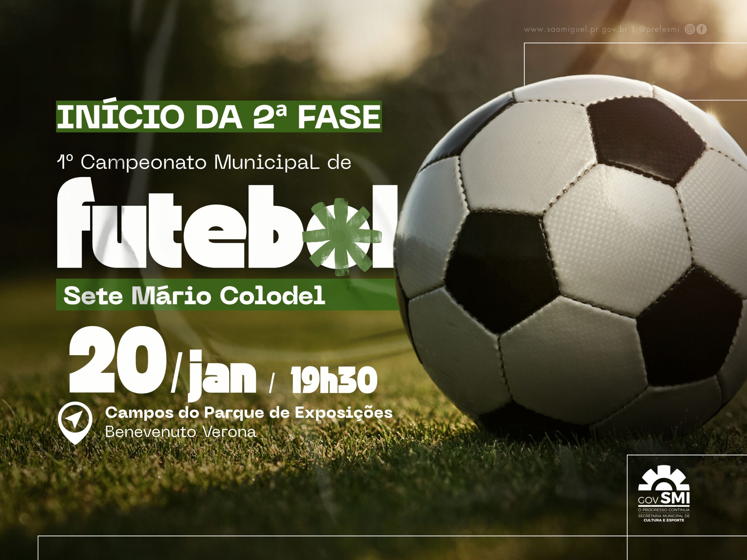 Terá início na noite desta terça-feira, 20, a segunda fase do 1º Campeonato Municipal de Futebol Sete Mário Colodel, que está sendo organizado pelo Governo Municipal de São Miguel do Iguaçu, por meio da Secretaria de Cultura e Esporte.