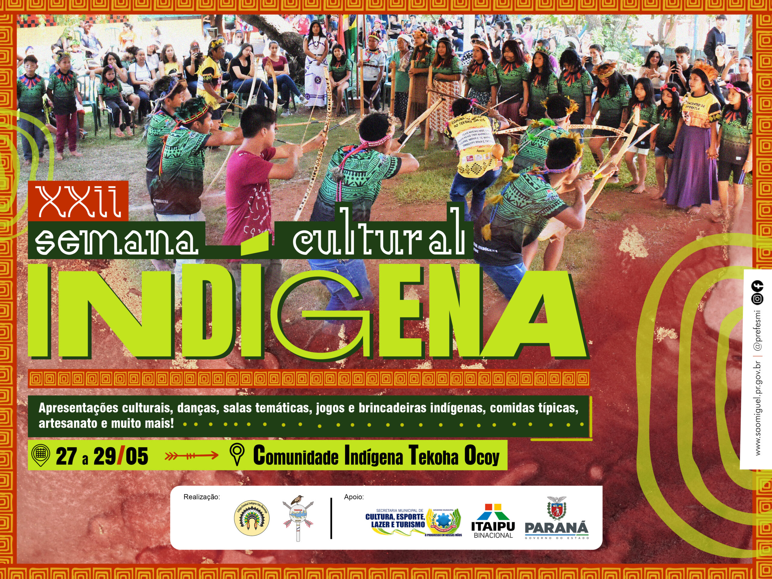 A Comunidade Indígena Avá-Guarani Tekohá Ocoy de São Miguel do Iguaçu e o Colégio Estadual Indígena Teko Ñemoingo vão realizar, com o apoio dos Governos Municipal e Estadual além da Itaipu Binacional, a 22ª Semana Cultural Indígena, de 27 a 29 de maio, na sede da comunidade.