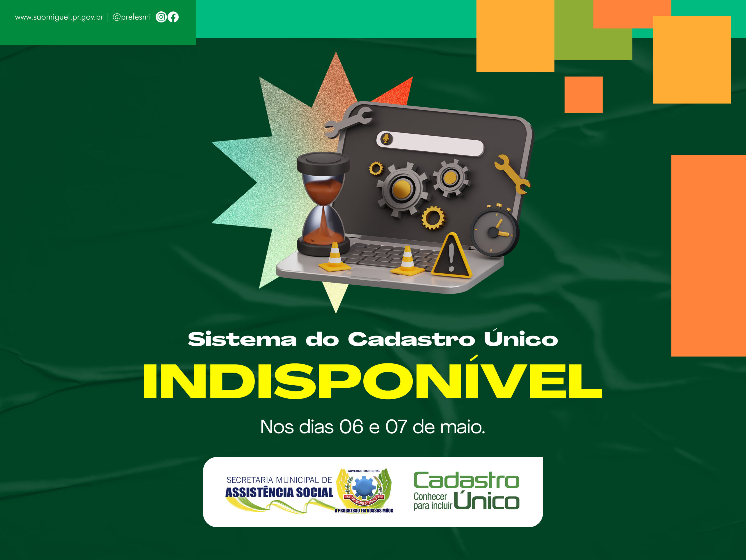 O Governo Municipal de São Miguel do Iguaçu, por intermédio da Secretaria de Assistência Social, informa que o Sistema do Cadastro Único do Governo Federal estará indisponível nesta segunda e terça-feira, dias 06 e 07 de maio.