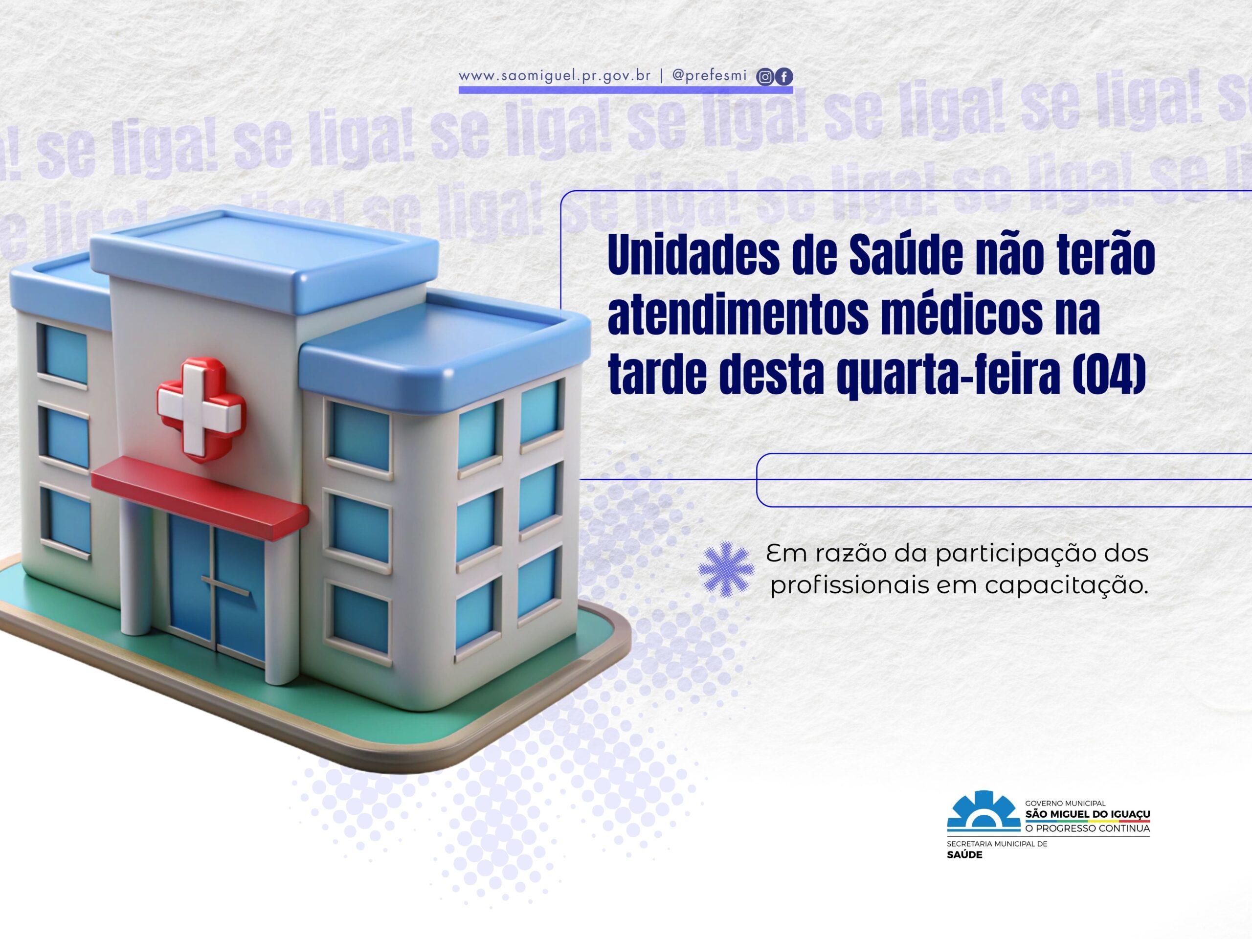 O Governo Municipal de São Miguel do Iguaçu, por meio da Secretaria de Saúde, informa que não haverá atendimento médico nas Unidades Básicas de Saúde na tarde desta quarta-feira, dia 04 de março, em razão da participação dos profissionais em capacitação.
